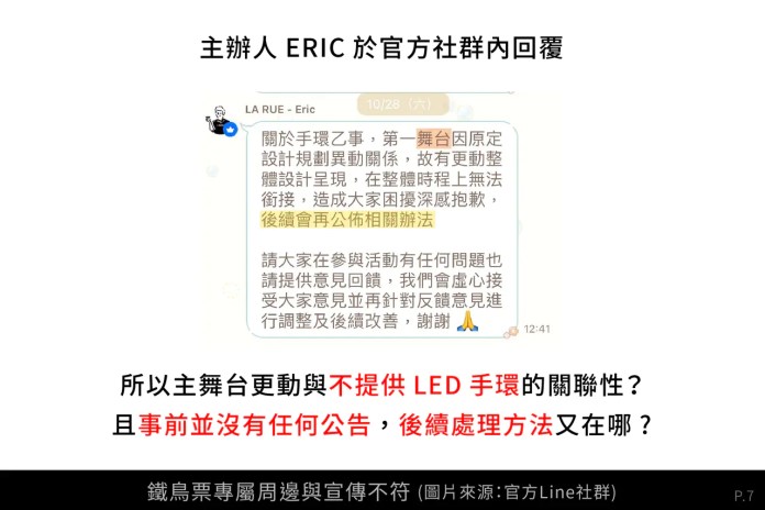一名網友表示在活動宣傳中,主辦方承諾購買鐵鳥票的參加者將獲得獨家的LED手環,可以與主舞台的表演連動,這一特點吸引了他的注意,當他在活動當天前往兌換台時,卻只收到了入場手環和一張貼紙,並未收到承諾的LED手環。他隨後聯絡了主辦方,並參加了LA RUE的LINE社群,詢問手環的下落。主辦方的回應是關於手環的規劃出現異動,但未能提供具體解釋或解決方案。
