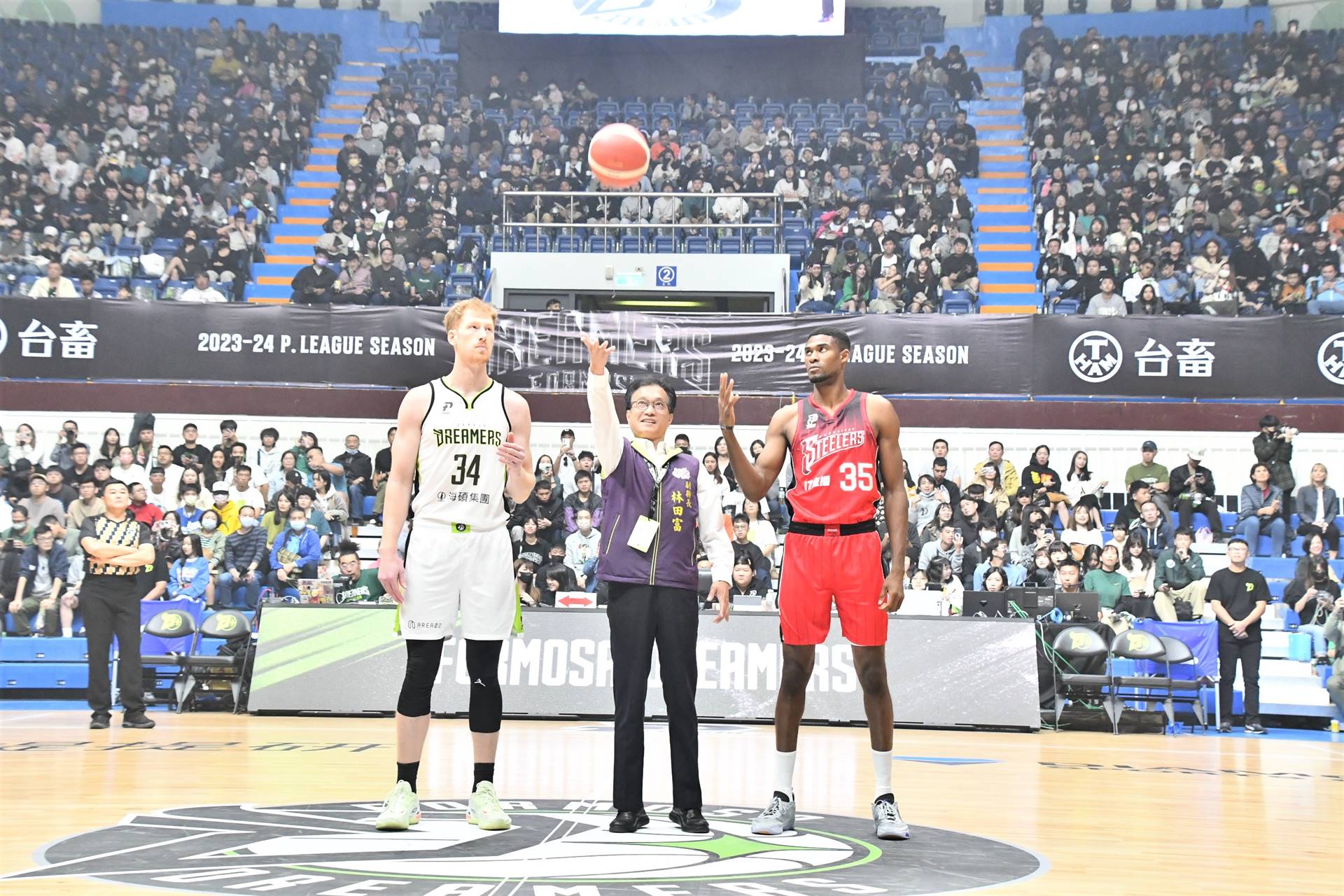 【記者 林明佑/彰化 報導】臺灣男子職業籃球聯盟(P.LEAGUE+)例行賽18日下午在彰化縣體育館火熱開打,由彰化地主隊福爾摩沙夢想家對上高雄17直播鋼鐵人,彰化縣副縣長林田富代表縣長王惠美受邀前往開球,也歡迎球迷除了到彰化來看球賽,也可以規劃一日遊,體驗半線的人文風光,來一趟與眾不同的籃球觀光之旅。