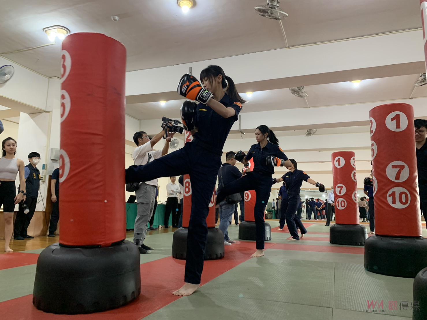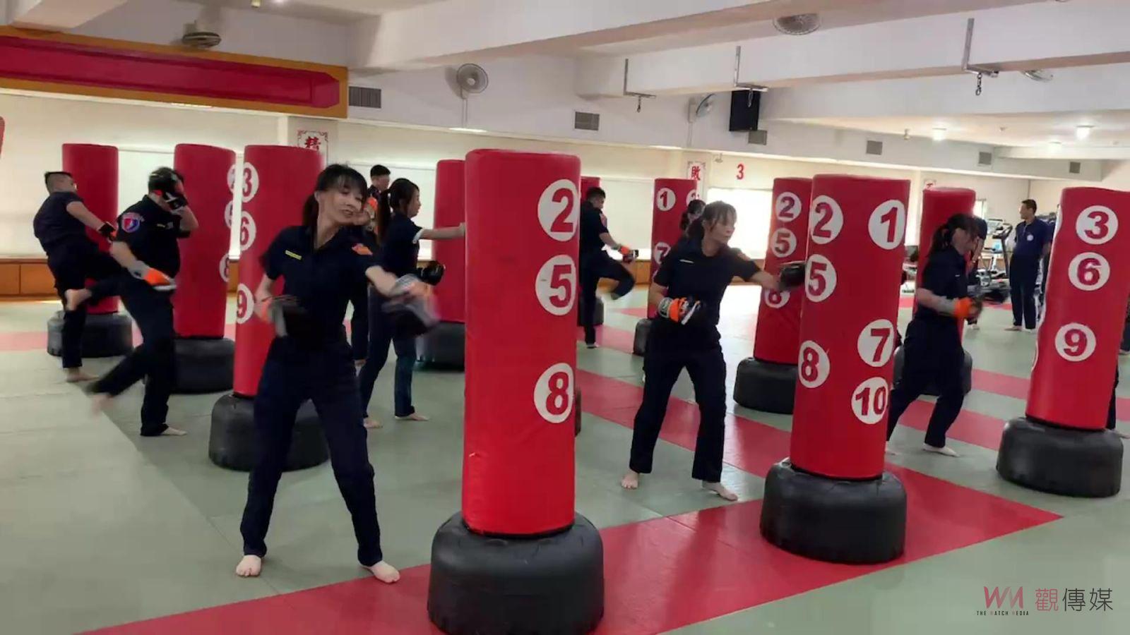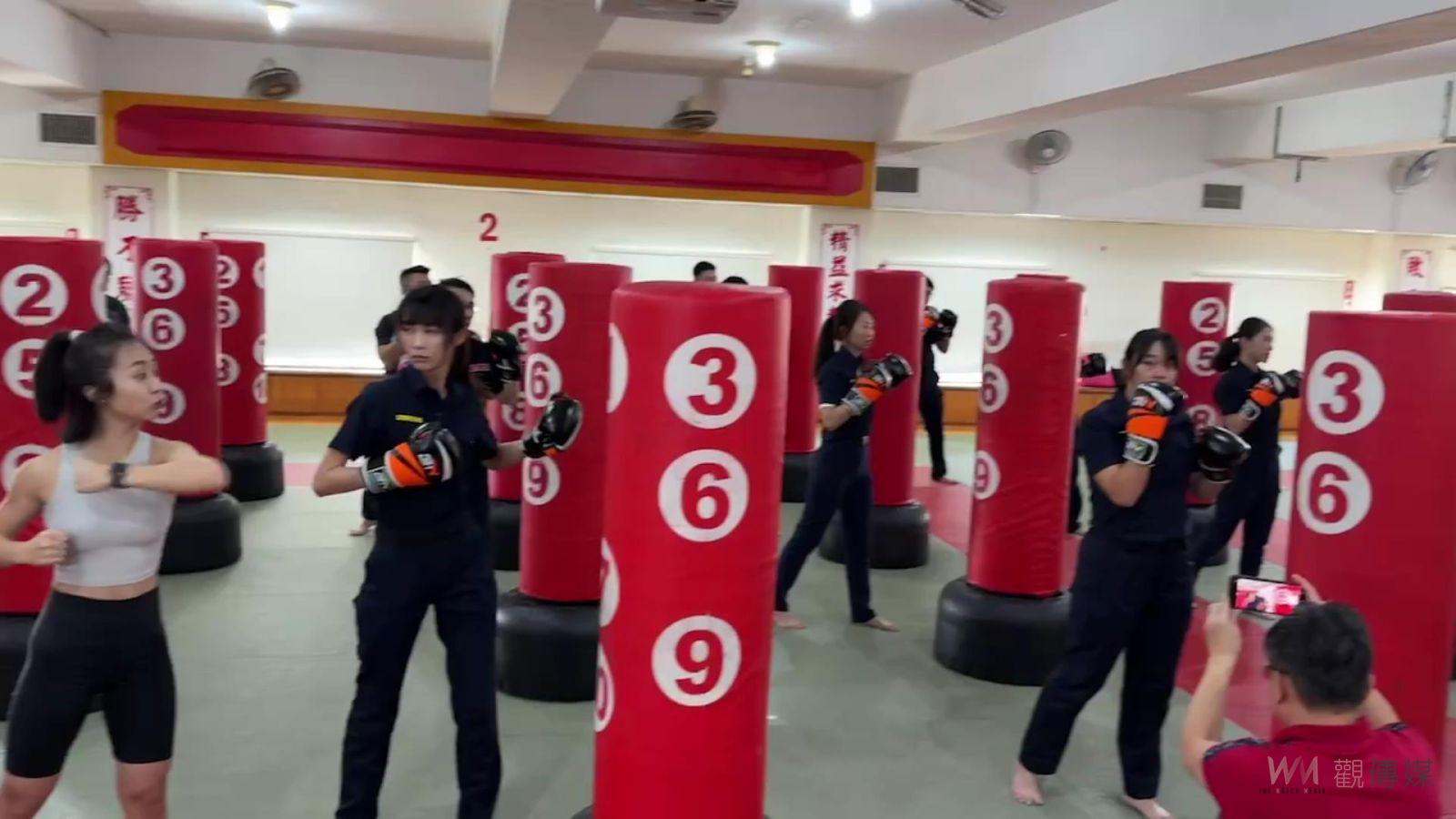 (觀傳媒彰化新聞)【記者陳雅芳/彰化報導】彰化縣警局獲贈23組紓壓身心的拳擊立靶,今(30)日找來健身教練訓練男女警員,有最美所長稱號的溪湖分局媽厝所所長黃衣淳現學現賣,連續揮拳後1腳踹翻立靶,不一會即香汗淋漓,直呼「好喘」,引發現場一陣驚呼。