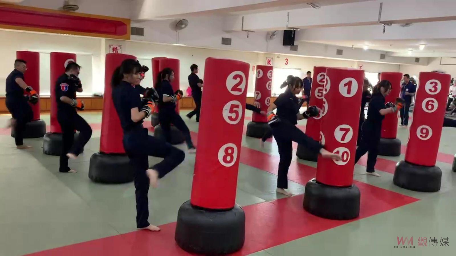 為正確使用拳擊立靶等健身器材,彰化縣警局訓練教官團隊及霹靂小組成員等都前來共同學習交流,縣警局體技館現場擺放滿滿拳擊立靶,員警們先是實施原地跳、抬腿跑步等有氧運動,接續戴著手套跟著健身教練施作揮拳、踢腿等動作練習,短短1個小時訓練即滿身大汗。
