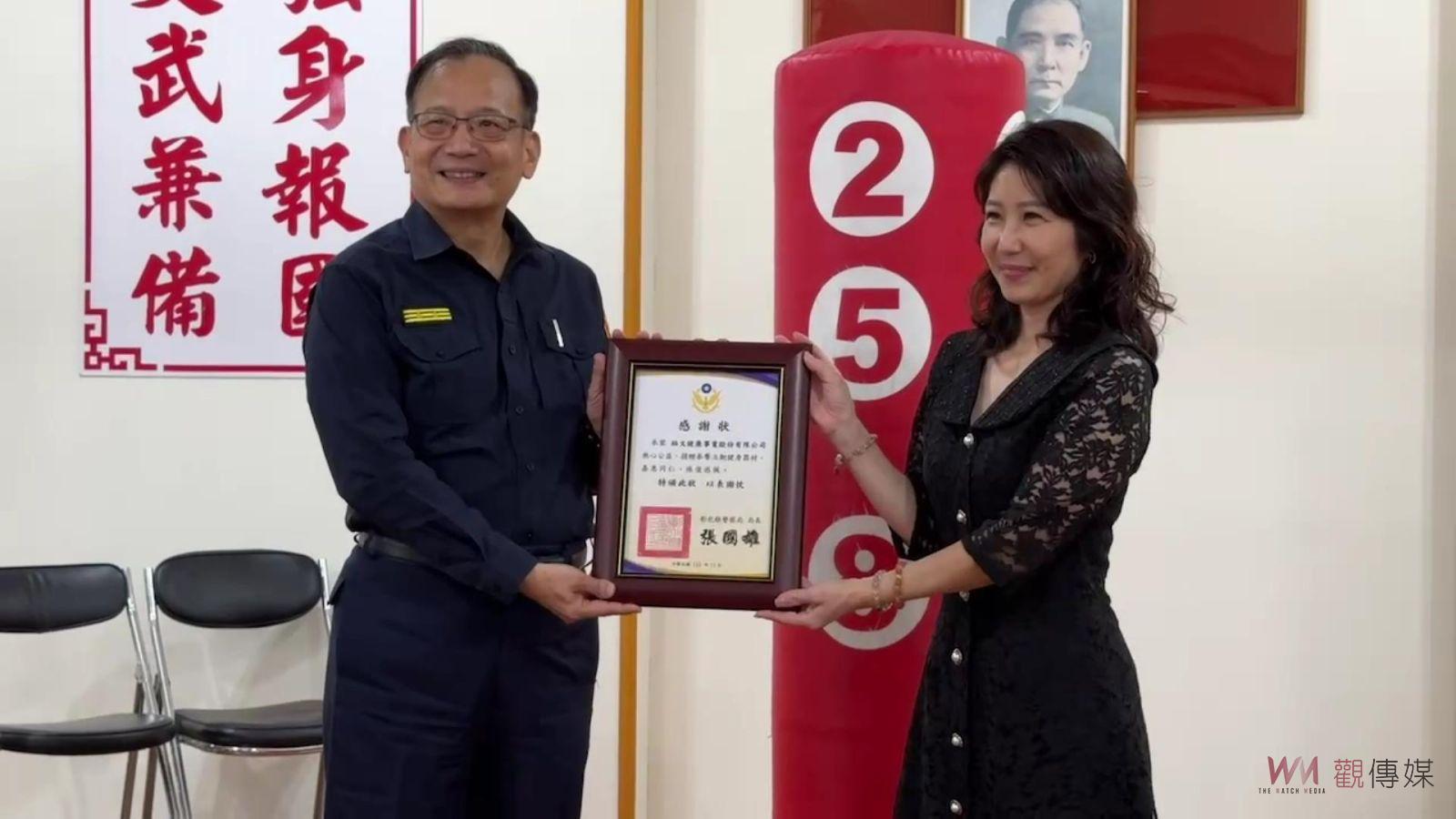 ▲彰化縣警察局獲贈23組紓壓身心的拳擊立靶,彰化縣警局長張國雄也回贈感謝狀。