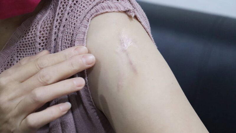 另一位50歲顏小姐的蟹足腫在左肩,她表示,小時候被躲避球打到之後破皮,後來就變成蟹足腫,因此她從不穿無袖衣服,她還在思考要不要治療。
