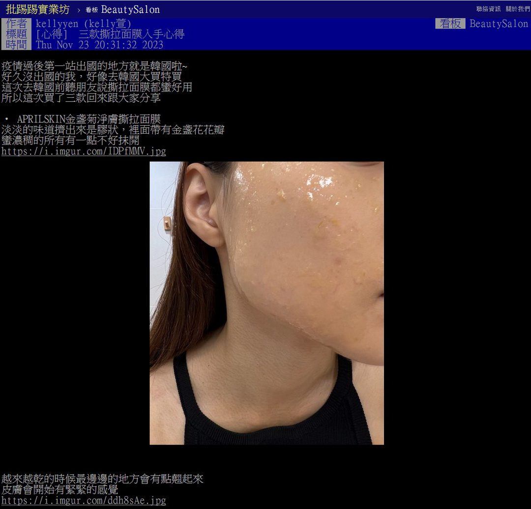 第一款是APRILSKIN金盞菊淨膚撕拉面膜,這位網友描述說,這款面膜具有淡淡的香氣,擠出來呈膠狀,內含金盞花花瓣。然而,針對其中包含新鮮花瓣的保存方式,有敏感肌膚的網友提醒需要謹慎使用,建議在皮膚科醫生的建議下使用。
