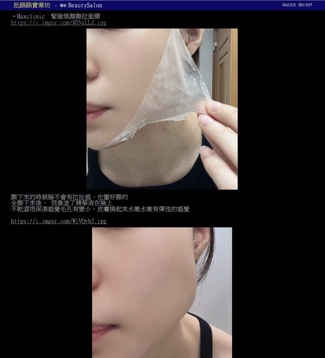 第二款是Maxclinic緊緻煥顏撕拉面膜,網友表示,這款面膜呈白色狀態,比乳液稍濃稠。隨著使用時間的增長,面膜會變得透明,表面帶有一點油油的感覺,類似精油。使用者還指出,撕下來的時候臉部沒有拉扯感,皮膚水潤有彈性。
