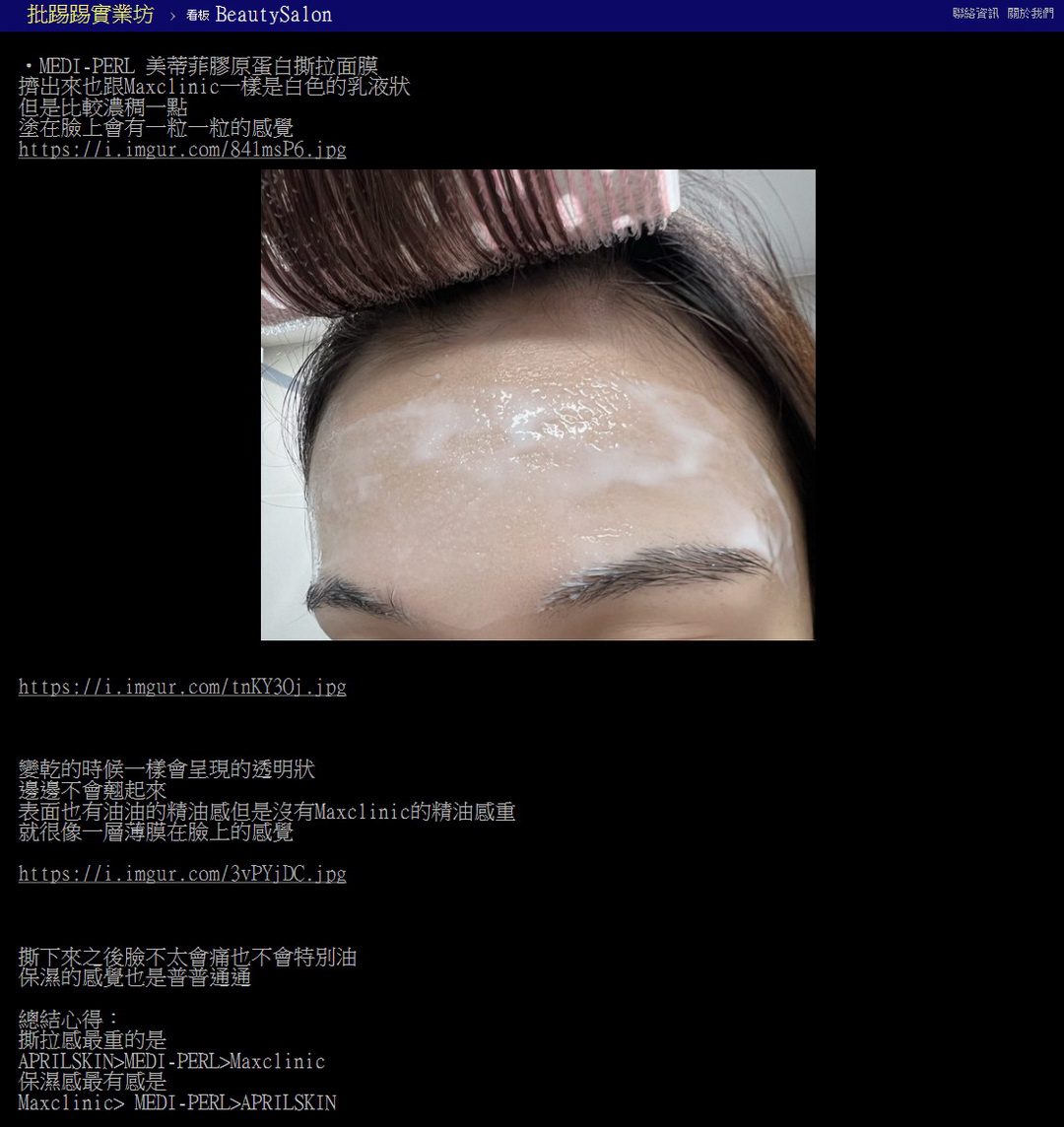 第三款是MEDI-PERL美蒂菲膠原蛋白撕拉面膜,網友形容擠出來同樣是白色乳液,塗在臉上有一粒一粒的感覺。雖然在變乾的過程中呈現透明狀,且表面有油油的精油感,但整體滋潤性相當不錯,只是提拉效果稍弱。