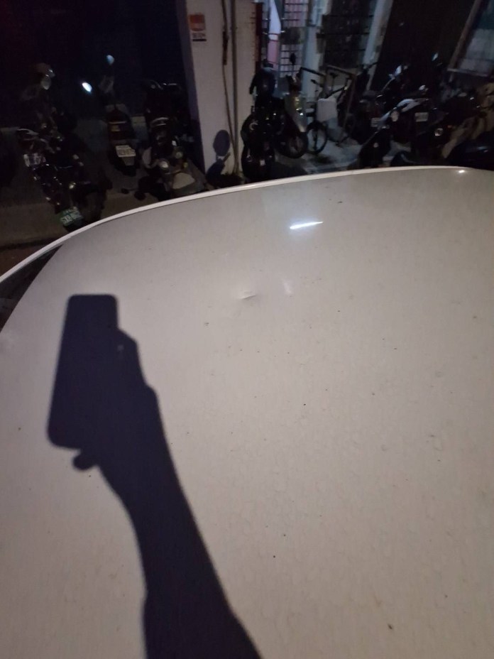 【記者爆料網 /高雄報導】半夜聊天太大聲,竟遭住戶從高樓扔馬克杯警告。離譜狀況就發生在高雄鼓山區,16日凌晨12點多,一名侯姓男子(25歲)與3名朋友站在雄峰路旁聊天,疑似因音量太大,吵到附近住戶,遭住戶從樓上潑水、扔馬克杯。結果,馬克杯不偏不倚砸中侯男停放在路邊的白色轎車,造成車頂鈑金凹損,幸好沒有人員傷亡,警方獲報到場處理時,侯男表示不願提出告訴。