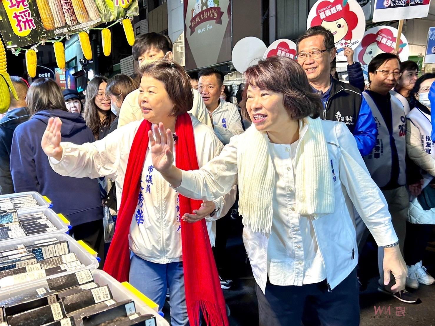 (觀傳媒嘉義新聞)【記者陳惲朋、郭政隆/嘉義市報導】嘉義市12/16日辦理國際管樂節踩街活動,有來自國內外53隊隊伍參加踩街,一路從中山路踩街至體育場,身兼侯友宜、張秀華聯合競選總部的黃敏惠與張秀華,於晚間參與完變換隊形表演晚會後,九點抵達文化公園諸羅印象牆與輔選團隊會合,隨即在發言人鄭光宏、黨籍議員傅大偉、陳家平等人陪同下,前往文化路夜市掃街拜票,時值冷氣團來襲,有熱情民眾貼心送上圍巾讓兩人取暖,更有攤商送上「鐵定成功」雕刻藝品,預祝高票當選,張秀華感動不已,強調不會辜負市民期待。