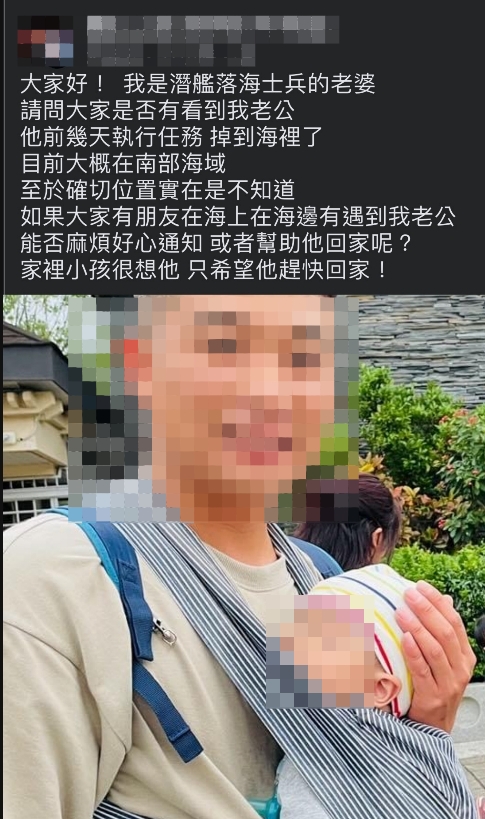 海虎潛艦人員落海,其中一名失聯的張姓士官妻子發文尋人,還貼上丈夫揹小孩的照片,令人鼻酸。(圖片翻攝 爆料公社臉書)張姓士官的妻子發文表示,「請問大家是否有看到我老公,他前幾天執行任務,掉到海裡了,目前大概在南部海域,至於確切位置實在是不知道,如果大家有朋友在海上在海邊有遇到我老公,能否麻煩好心通知, 或者幫助他回家呢?家裡小孩很想他,只希望他趕快回家」。