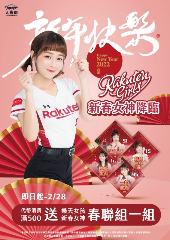 同時,為歡慶虎年到來,大魯閣棒壘球打擊場推出《Rakuten girls女神春聯》,來館消費滿500元,即贈送『籃籃、林襄、Yuri、孟潔 春聯』1組,讓女神陪您過年、「新春紅不讓」好喜氣!更多新春優惠訊息,可搜尋《大魯閣》官方網站,網址如下:https://www.trk.com.tw/