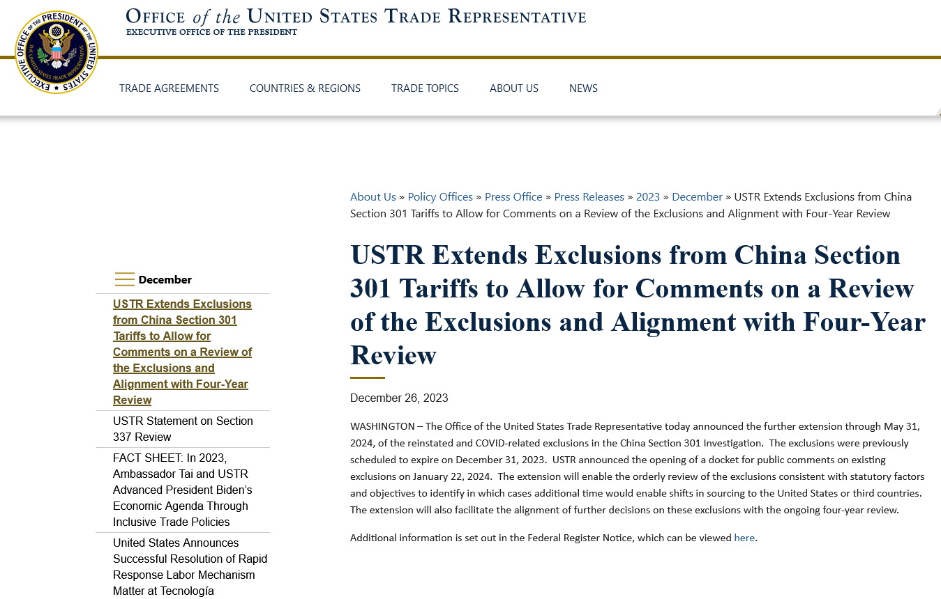 美國貿易代表署宣布,將延長對中國進口產品301條款豁免期限5個月,至2024年5月31日,並稱展延期限將有助於依序取消排除條款。遭豁免進口關稅的商品包括泵和電機等工業零件、部分汽車零件和化學品、自行車和吸塵器;被豁免關稅的新冠相關產品包括口罩、檢查手套和手部消毒濕紙巾等醫療產品。其中來自中國的進口商品共352項,另有77項COVID-19相關產品,共計429項。
