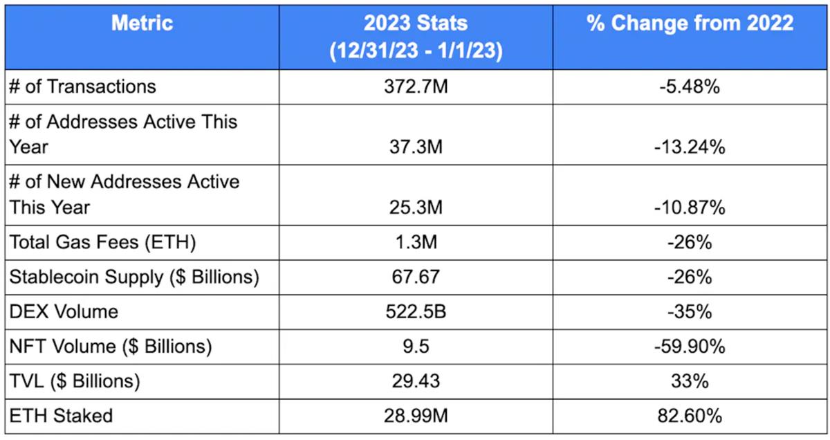 消極的一面:2023 年,所有主要指標都出現下降。值得注意的跌幅包括總 Gas 費(-26%)、 NFT 交易量(-59.9%)和 DEX 交易量(-35%)。