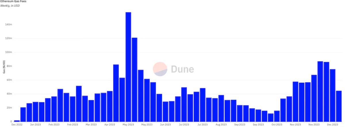 正面的一面:在 2023 年末,數據有所回升。 2023 年初至今,TVL 成長了 33%,這可能歸功於 ETH 和其他代幣價格的上漲。此外,儘管有一些指標表現不是很出色,但情況現在正在好轉,包括自 10 月以來 200 億美元的穩定幣流入,以及 Gas 的強勁上升趨勢。