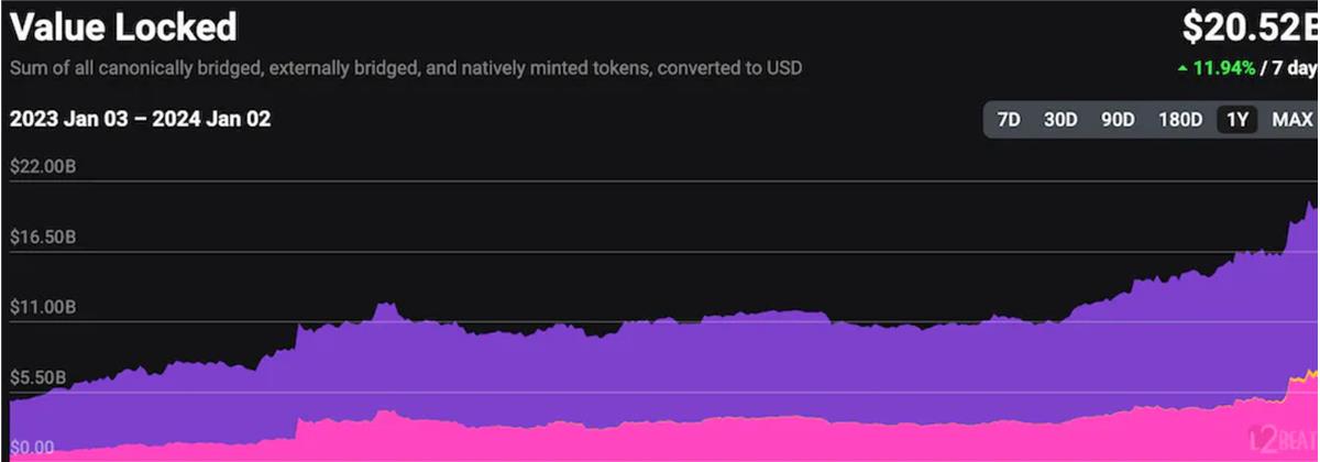 儘管以太坊的活動減少,但 L2 的使用持續成長。 2023 年初,市場上總共有 16 個活躍的 L2 和 49.5 億美元的 TVL 。到 2023 年底,市場上有超過 34 個 L2,TVL 達到 207.4 億美元。