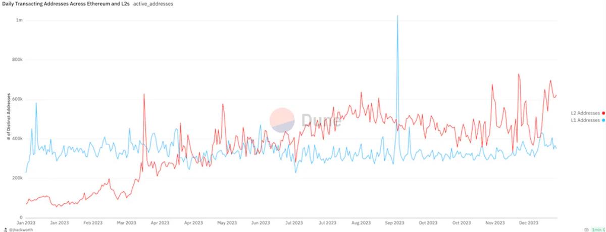 L2 採用的增加導致活動激增。 L2 上的活躍地址從不到 70,000 個地址增加到超過 400,000 個地址,甚至超過了以太坊的總地址。