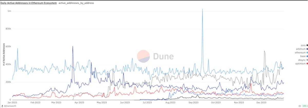 雖然 L2 的活躍地址總體上超過了以太坊,但仍然沒有一個 L2 能夠和以太坊相媲美:在 2023 年期間,僅有 9 天,單個 L2 的活躍地址超過了以太坊(zkSync,Arbitrum)。因此結論是:L2 仍需要進一步發展其生態系統和基礎設施,以與以太坊的活動相抗衡。