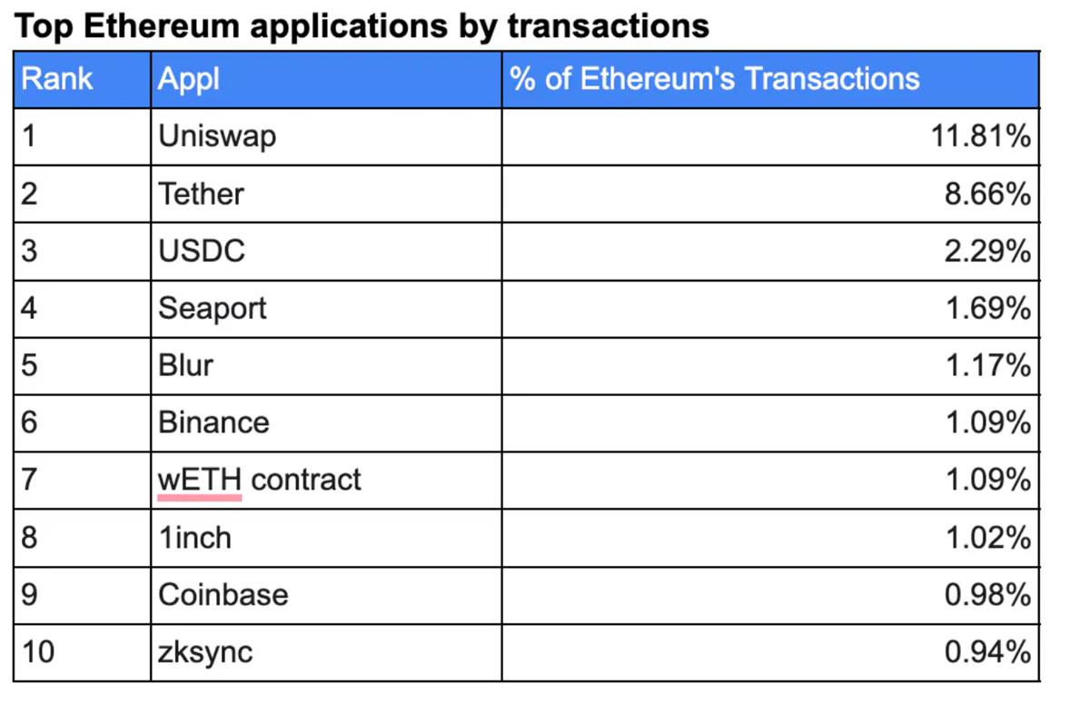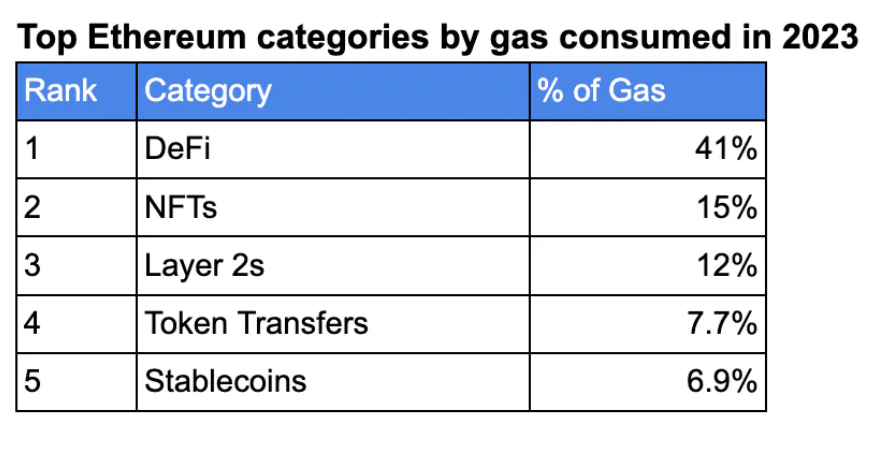 - USDC 和 Tether 是交易量最高的兩個應用,佔 Gas 使用量的 7%,突顯了以太坊上對穩定幣的需求