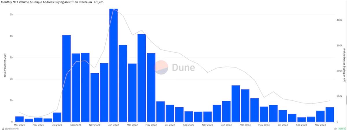 此外,2023 年 9 月,NFT 交易量達到了兩年來的最低點。不過,最近 L2 的上升和對 NFT 用例表明,沒有人能確定 NFT 未來會發生什麼。