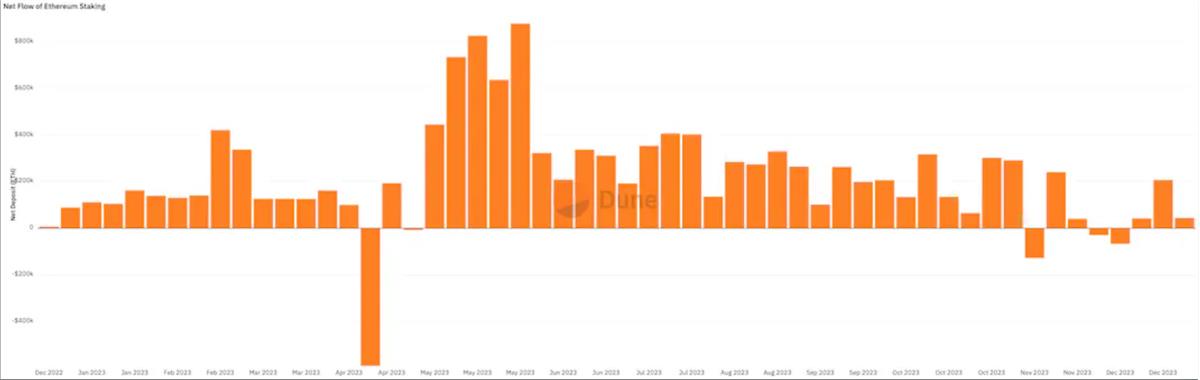 2023 年是 ETH 從信標鏈提現的元年,導致大量資金流入質押。 2023 年,質押的 ETH 供應量增加了 82.6%,現在約有 24% 的 ETH 供應量被質押。 2023 年是 ETH 質押數量增幅最大的一年。