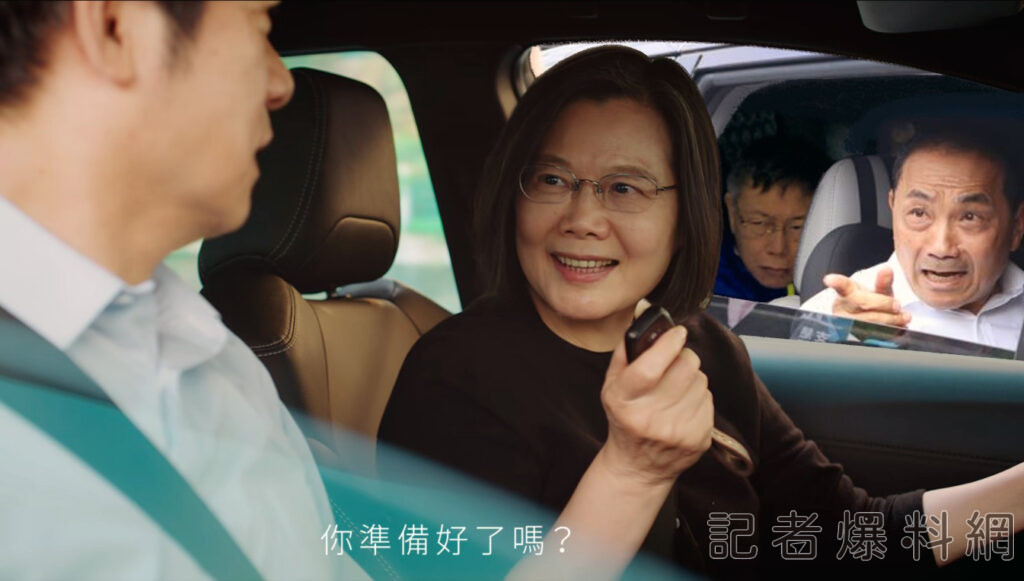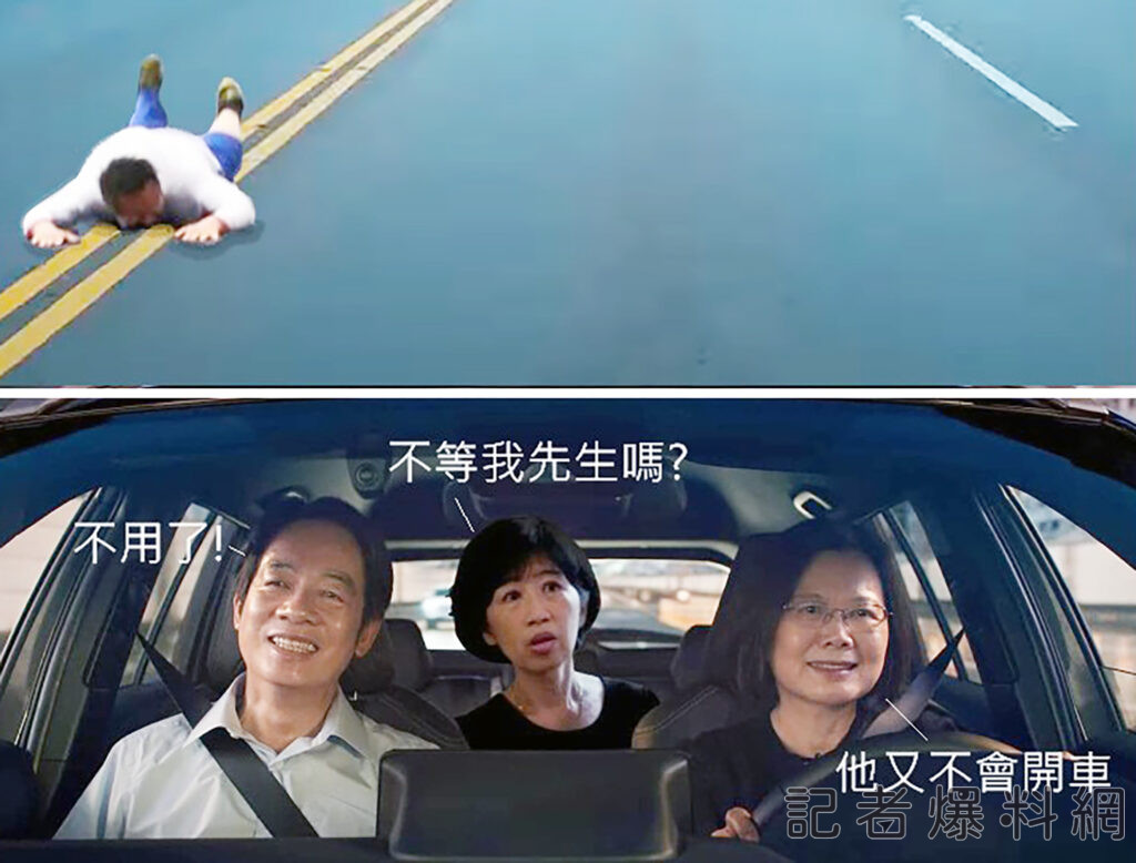 蔡英文與賴清德、蕭美琴合拍《在路上》競選影片,網友無揮無窮創意。翻攝畫面影片中蔡英文開車一路載著賴清德,並把國政未來鑰匙交給「賴蕭配」,還鼓勵「你們一定會開得比我更好」;但網友開始惡搞,有的後製成車子開到賴清德萬里老家,也有侯友宜及柯文哲共乘一部車在旁邊。