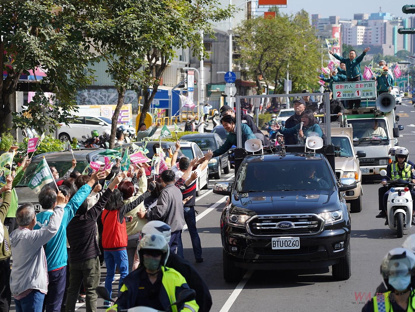 (觀傳媒嘉義新聞)【記者陳惲朋、郭政隆/嘉義市報導】總統、立委選戰來到倒數第4天,在這緊張時刻,各參選人莫不把握最後衝刺機會,使出渾身解數,以求贏得最後勝利,在此同時,民進黨總統候選人賴清德與副手蕭美琴本周展開「我們一起在路上」全台車掃行動;而1/9日的大車掃,賴清德與王美惠由嘉義市王美惠競選總部出發,兩人在戰車上繞行嘉義市區掃街拜票,沿路吸引不少熱情鄉親,在路旁揮舞旗幟熱烈歡迎,展現超高人氣,沿途「凍蒜!凍蒜!」高喊聲不絕於耳,更是展現團結一心的勝選氣勢。
