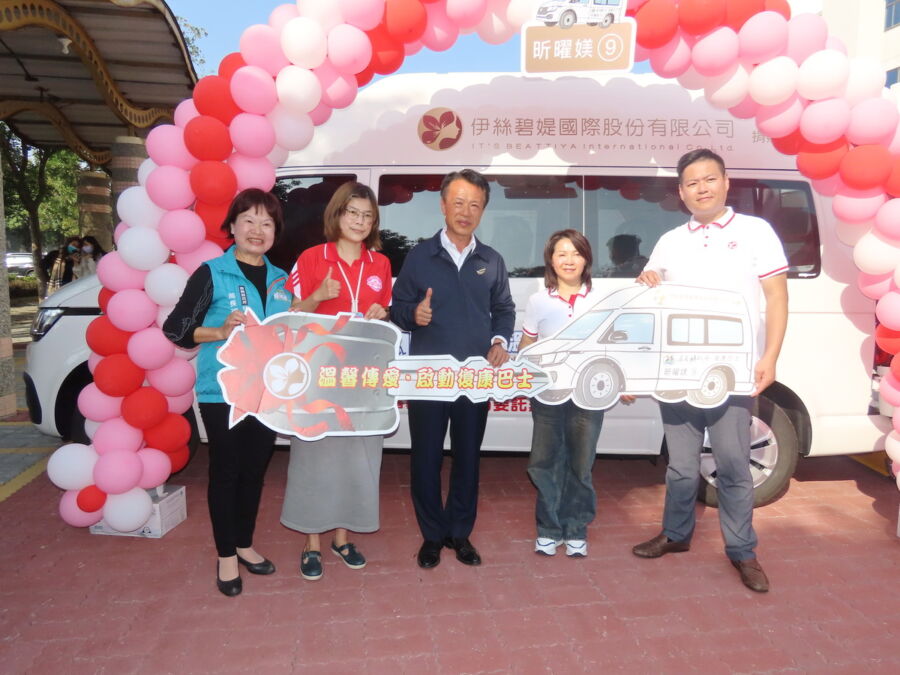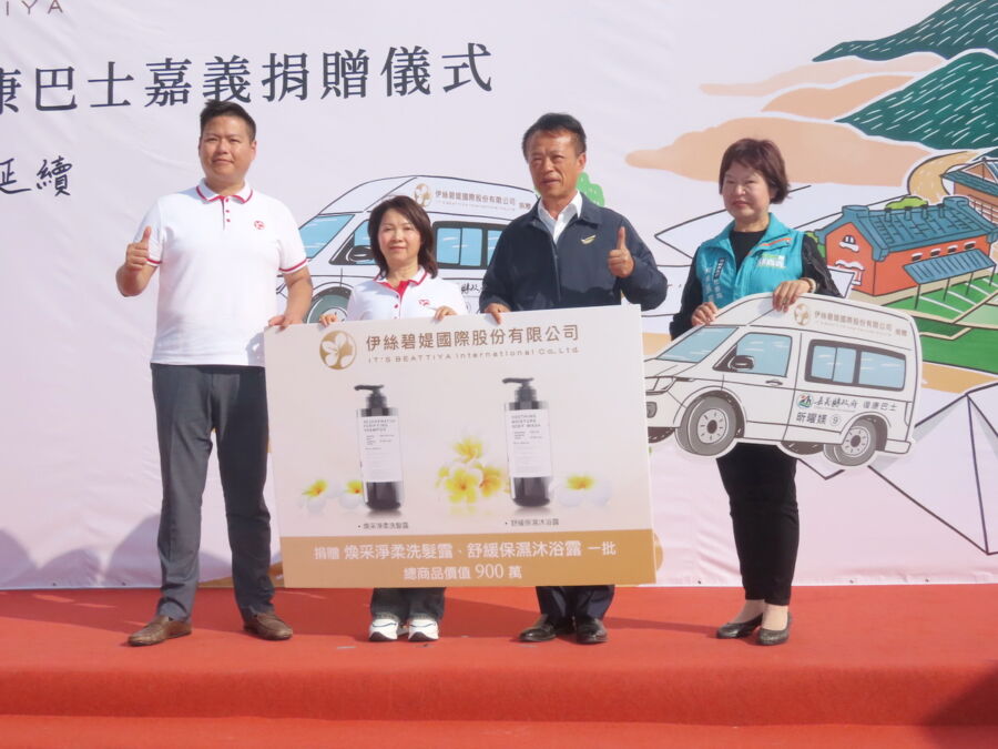 (記者黃信峯/嘉義報導)嘉義縣部分小型復康巴士老舊需汰換,桃園伊絲碧媞國際股份有限公司劉依淳董事長、陳睿紳總經理及王沛嫺總顧問得知後,慷慨捐贈高頂復康巴士一台及洗髮精、沐浴乳各5,000瓶,今(15)日在嘉義縣社會局前廣場舉行捐贈典禮,由嘉義縣長翁章梁代表接受並致贈感謝狀。