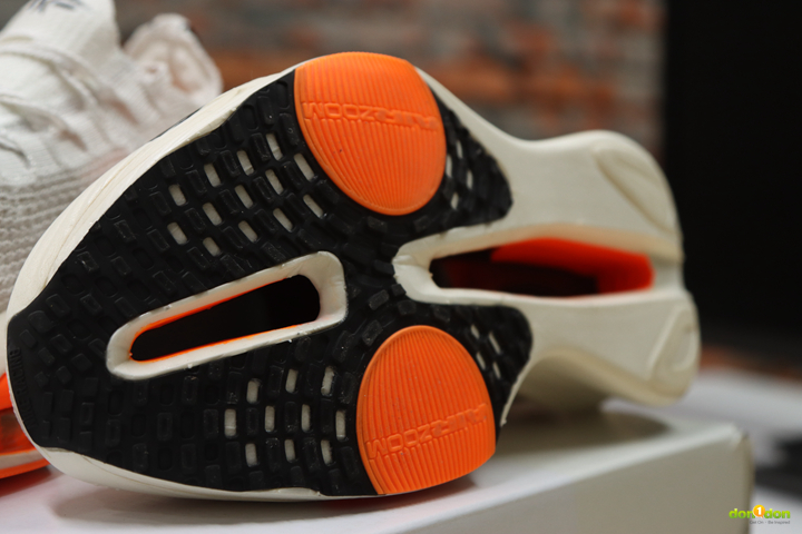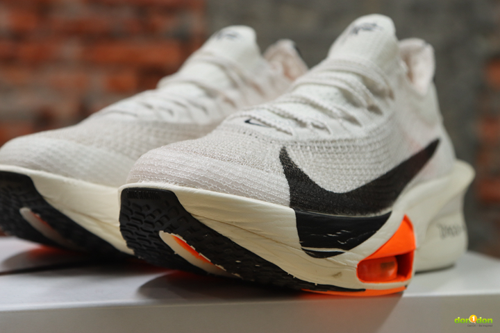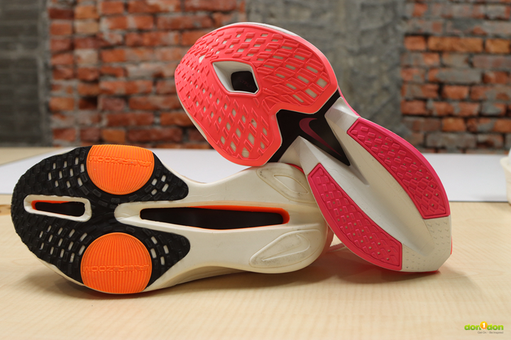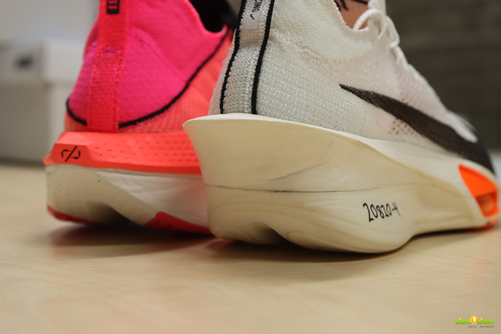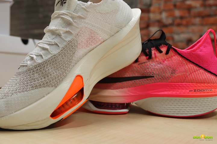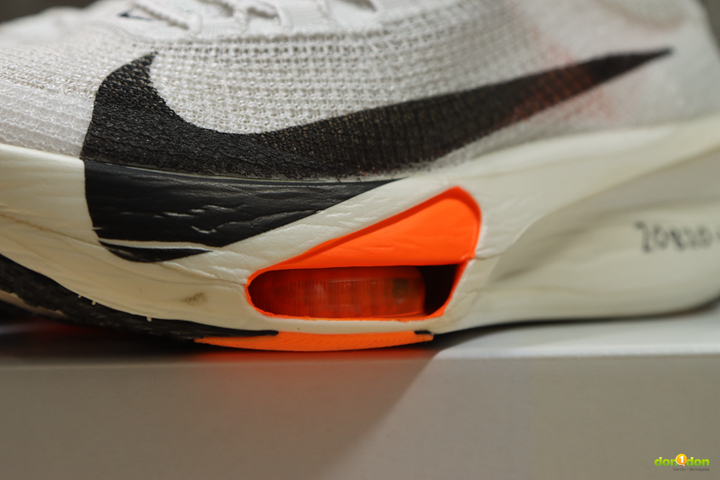 Alphafly 2 的 Air Zoom 氣墊是可目視,甚至可以觸摸得到的。而 Alphafly 3 儘管從外側也能看見,但從大底處窺去,已經是被融入中底系統之中。在甚早之前開發的 Tempo next% 曾有都市傳說,其中的氣墊在踩到銳利的釘子之類的很可能會破掉。而 Alphafly 3 的設計似乎更能保護氣墊,也讓無論是後腳跟落地往前滾動、中足(全腳掌)及前踵落地的跑者都能全面適用。