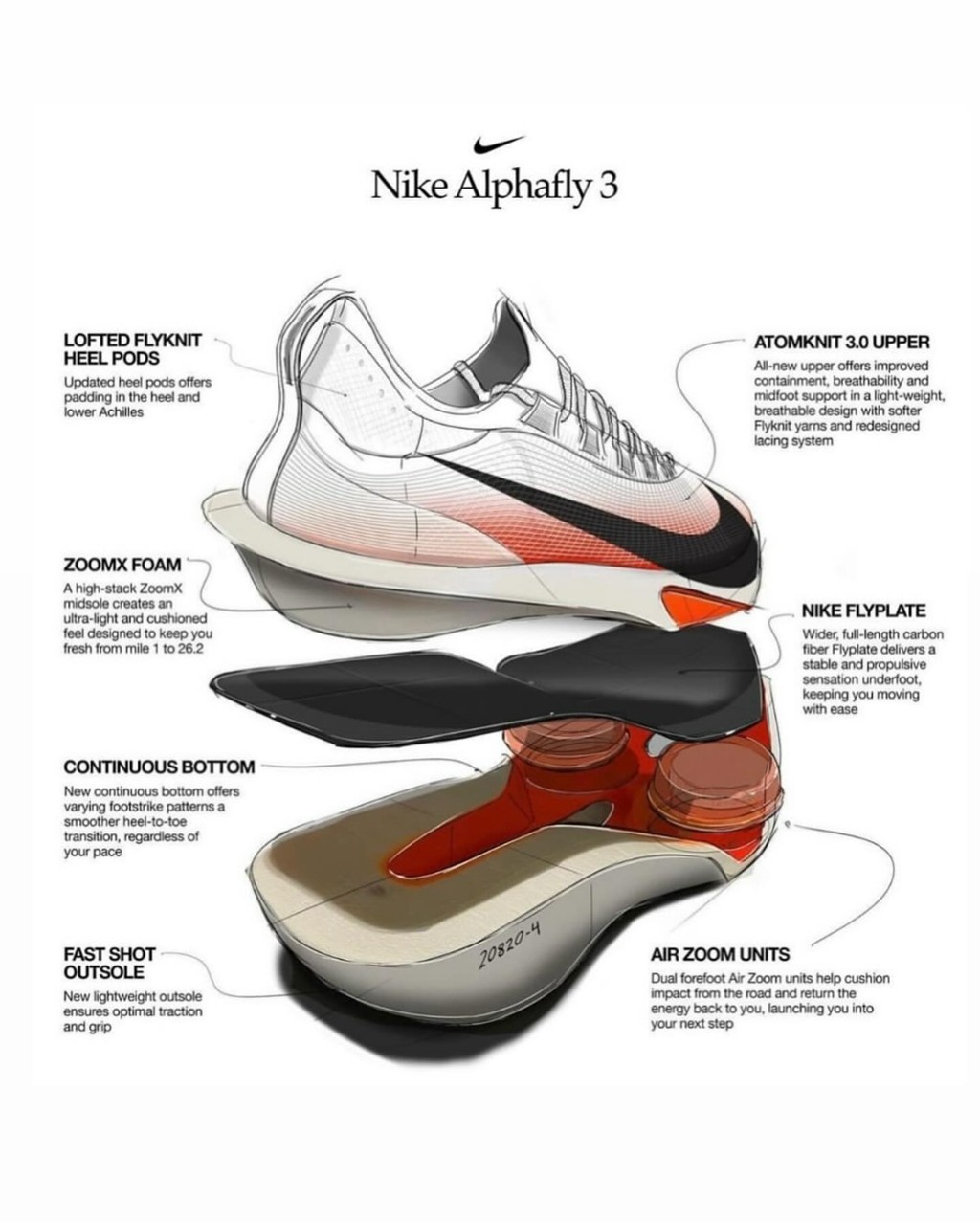 由 Air Zoom 氣墊、 ZoomX 泡棉和 Flyplate 碳纖維板構成的中底系統,是造就最佳成績的主因。 NIKE Alphafly 3經歷諸多菁英選手的測試與紀錄,高頻的內部測試驗證後提出結論, Alphafly 3 是 NIKE 史上最輕盈的 Alphafly 跑鞋,其唯一的取向是為了幫助跑者取得更佳的成績。