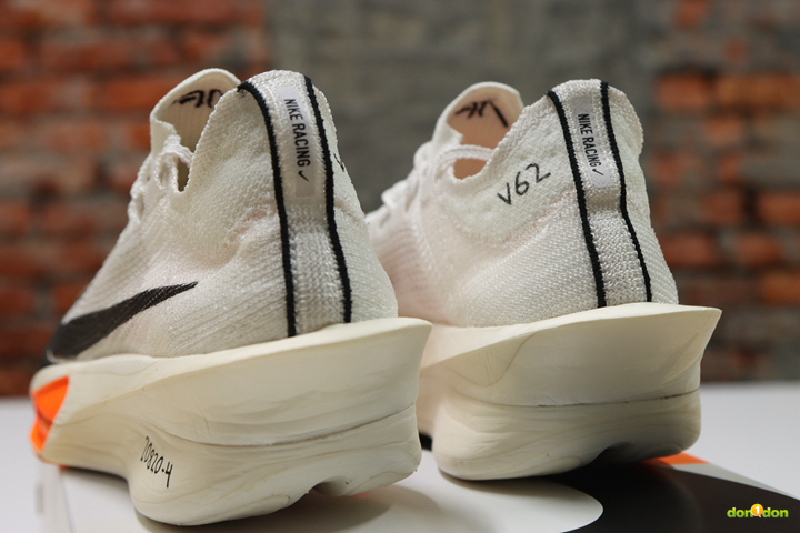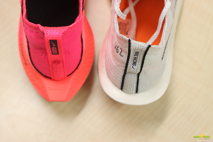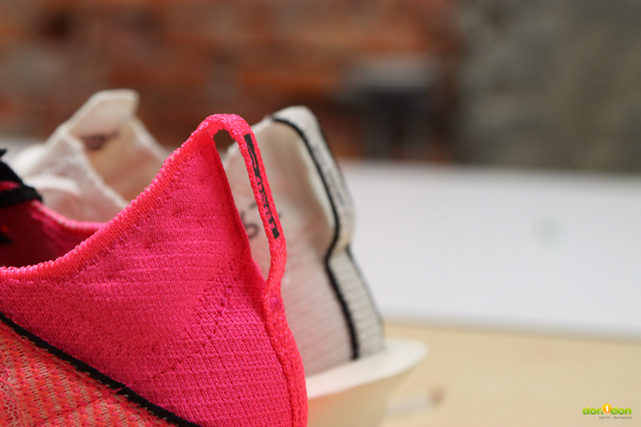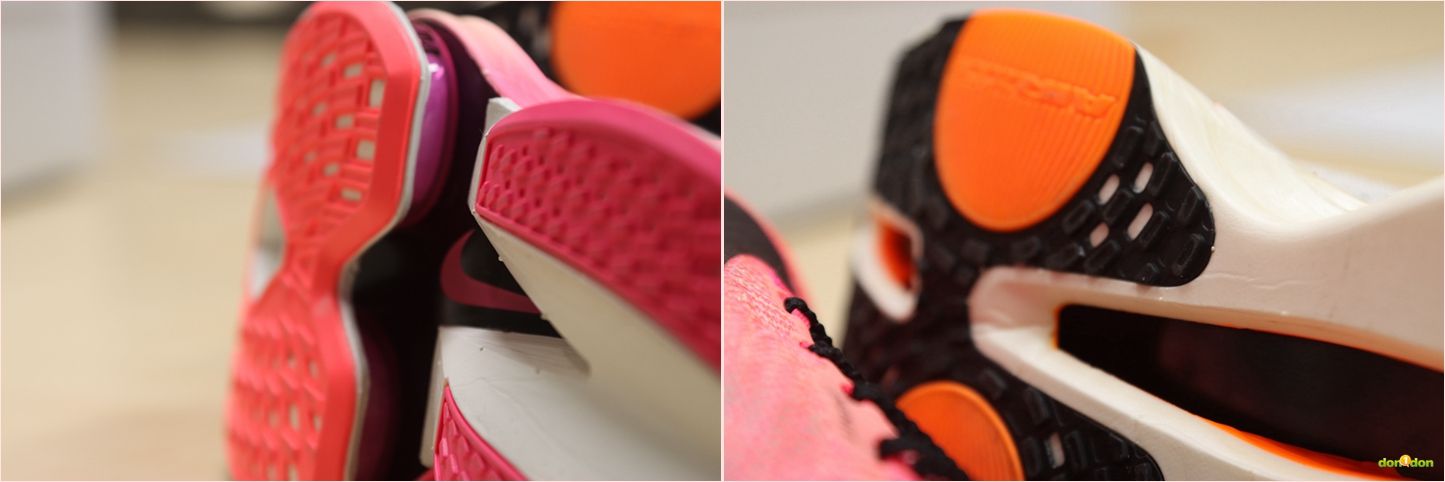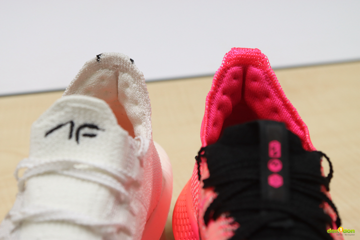 在後跟處的 Lofted Flyknit 後跟襯墊為足跟和跟腱提供緩衝,這是為了舒適性與跑感所設計,兩代之間似乎差異不大。但 3 代的後跟高度明顯比 2 代稍高 2 毫米,同時設計也不同於 2 代比較厚重感, 3 代部分更顯銳利。