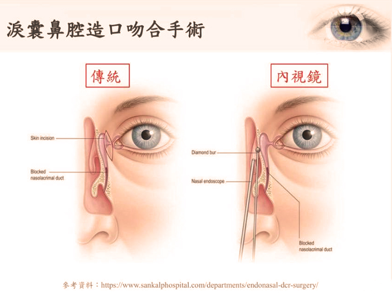 對於鼻淚管氣球擴張術合併矽質管植入治療無效或嚴重阻塞患者,則需要進行淚囊鼻腔造口吻合手術,手術分為傳統和微創內視鏡二種方式,微創內視鏡手術優點是避免造成眼周傷口,保留眼周組織及韌帶結構完整,提升淚水排出功能,近年來逐漸成為主流。