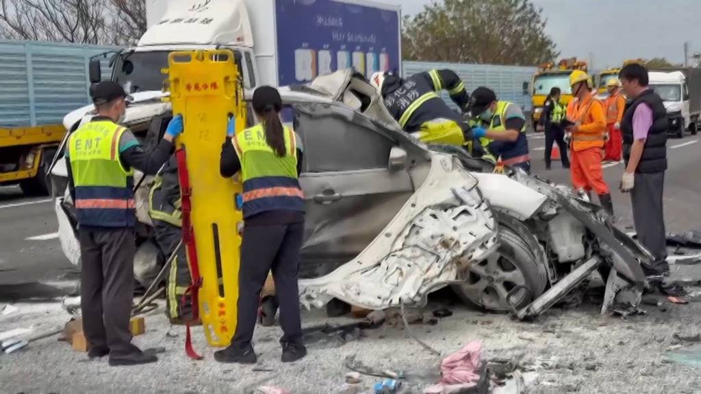 【記者 林明佑/彰化 報導】國道1號南下彰化路段197公里處,今天近中午發生6輛大小車追撞車禍,當時外側車道略有塞車,張男駕駛大貨車疑未注意車前狀況,直接撞前方黃男駕駛自小客車,導致黃男駕駛追撞前方大貨車,當場車體夾在前後2輛大貨車間,車體嚴重扭曲變形,這起重大車禍造成1死1傷,詳細事故原因與肇事責任有待警方調查釐清。