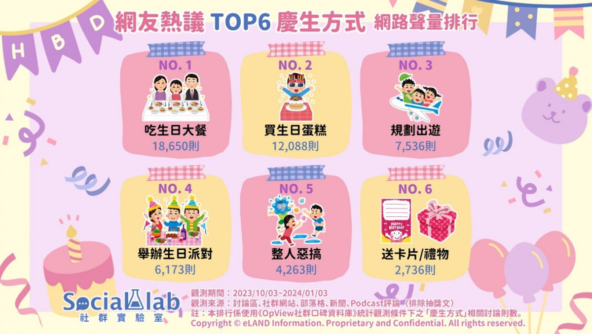 《Social Lab社群實驗室》本次透過《OpView社群口碑資料庫》追蹤近三個月內「慶生方式」話題的網路聲量表現,帶您了解網友熱議的前6大慶生方式。