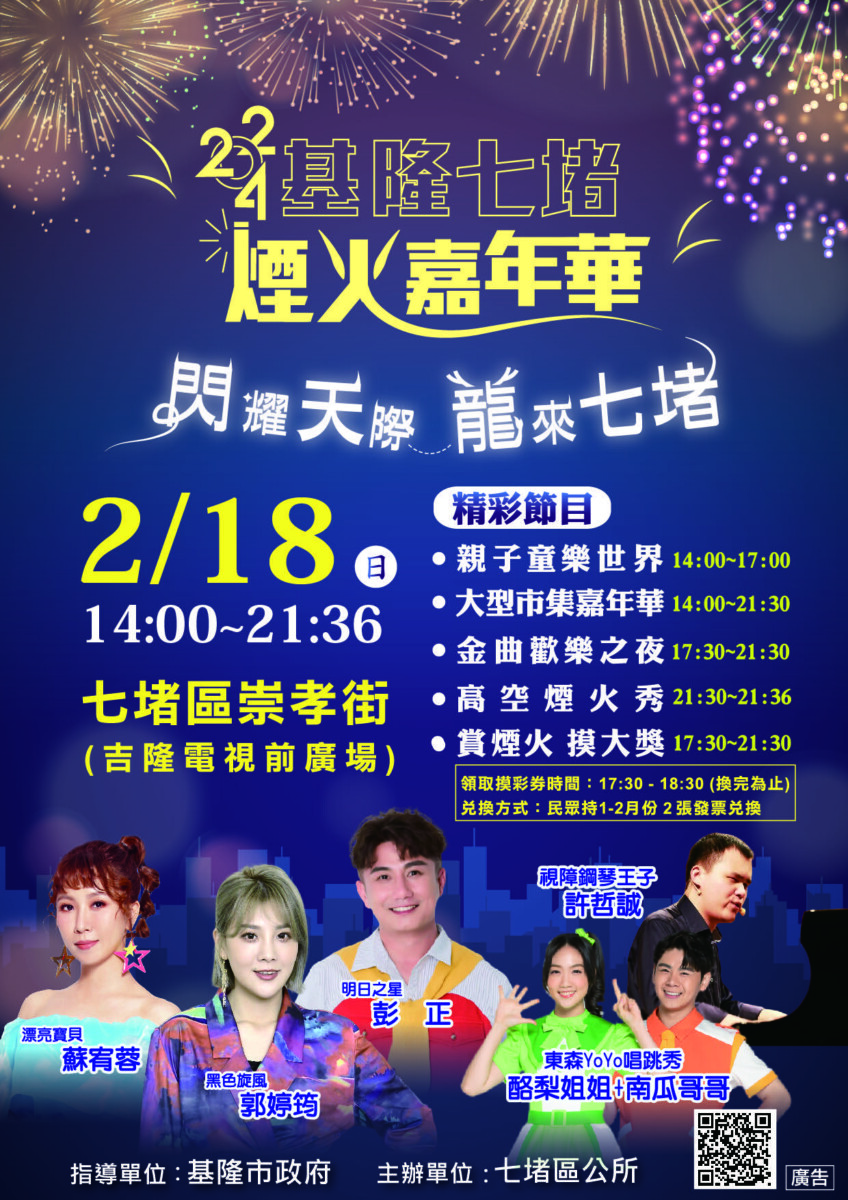 今年的「親子同樂世界」從下午2:00~5:00,特別舉辦在公車停車場旁的永安公園內,希望能讓大、小朋友們有更多玩樂、嬉戲的空間,親子童樂世界的舞台區下午2:00~4:30有「街頭藝人朱莉樂團」的抒情演唱之外,還邀請到最受歡迎的「東森YoYo唱跳秀 – 酪梨姐姐、南瓜哥哥」在下午4:30~5:00進行演出,除了舞台區的表演外,還安排了「小丑折氣球」在現場巡迴、與民眾互動,和免費體驗的彩繪面具DIY(限量200份)、龍年燈籠製作(限量400份),並於下午4:00~5:00期間,在龍年燈籠服務台免費發放400份燈籠,供民眾帶回家製作,還有今年特別規劃有「親子童玩區」,提供各種童玩設施供親子一起玩樂。下午5:30~9:30的「金曲歡樂之夜」,邀請到「黑色旋風 郭婷筠、漂亮寶貝 蘇宥蓉、明日之星 彭正、視障鋼琴王子 許哲誠」於現場熱情演出,還有七堵在地社團的熱情演出,為高空煙火秀完美預熱。