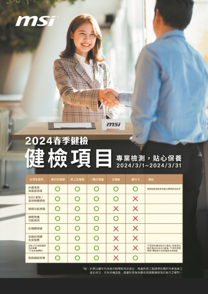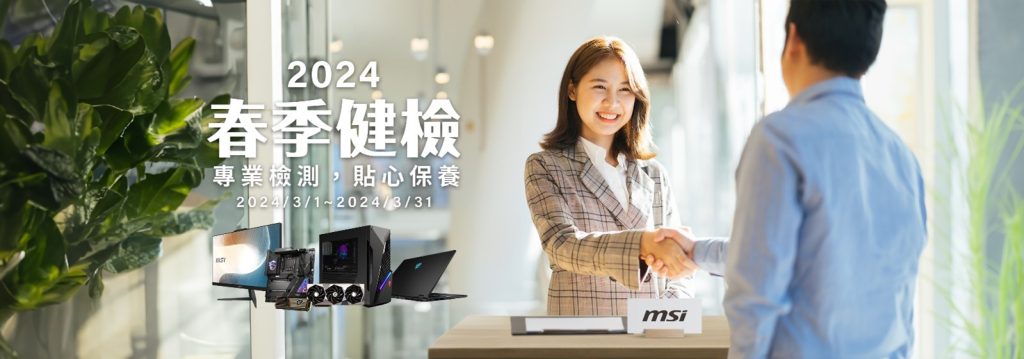 【記者 陳家珍/台北報導】全球電競、創作者、商務產品領導品牌MSI宣布,【2024春季健檢】活動將於 3/1正式開跑!3/1-3/31活動期間,持MSI筆電、桌上型電腦、AIO一體成型電腦、主機板、顯示卡任一款,至MSI服務中心或透過網路預約到府收送,即可免費享健檢服務一次!