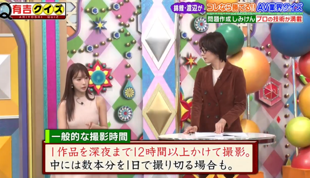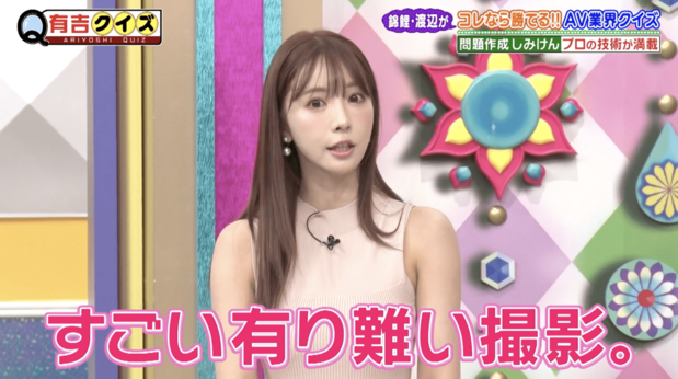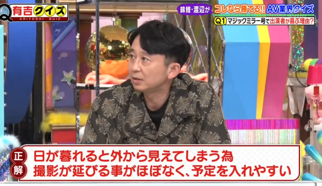 翻攝自TVer朝日電視台26日播出的《有吉Quiz》中,節目問「為什麼AV女優喜歡拍魔鏡號?」有吉弘行猜到了正確答案,那就是因為就算是晚上,魔鏡號裡面也相當的亮,所以可以很快得完成拍攝。