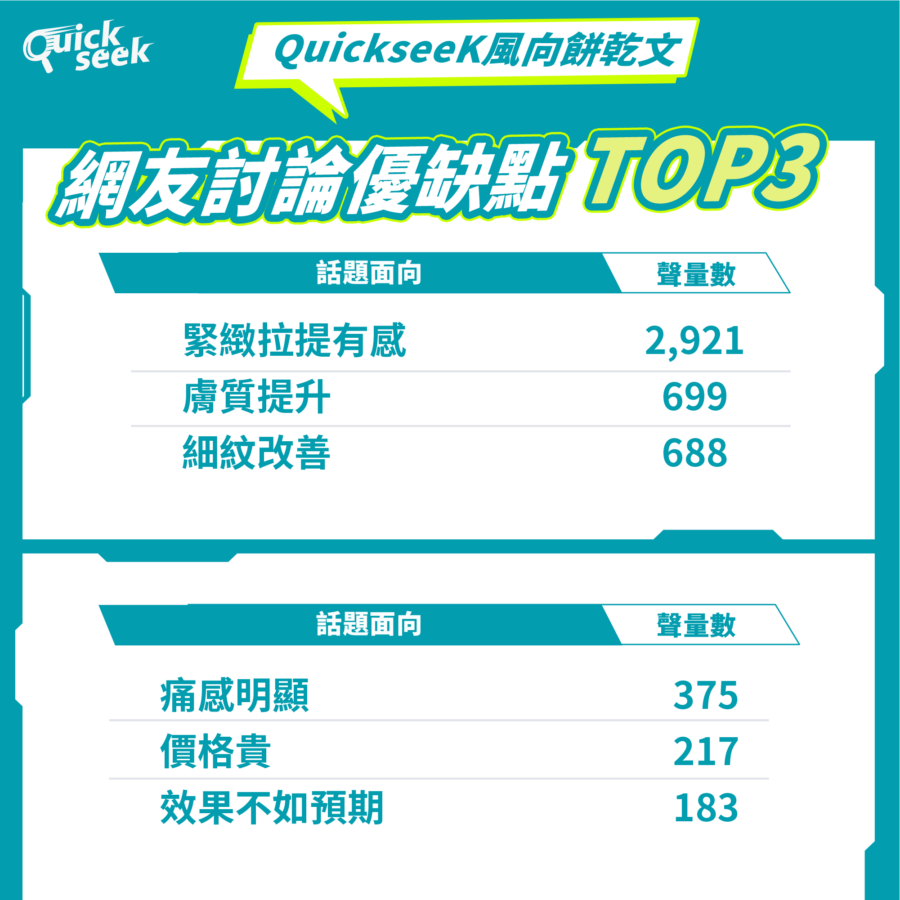 QuickseeK透過網路聲量發現,近一年「鳳凰電波」討論度逐漸上揚成醫美寵兒,其中「緊緻拉提有感」獲得壓倒性的高討論度,雖然亦有部分網友反應有痛感明顯、價格偏高等問題,不過整體而言其評價仍是正大於負。