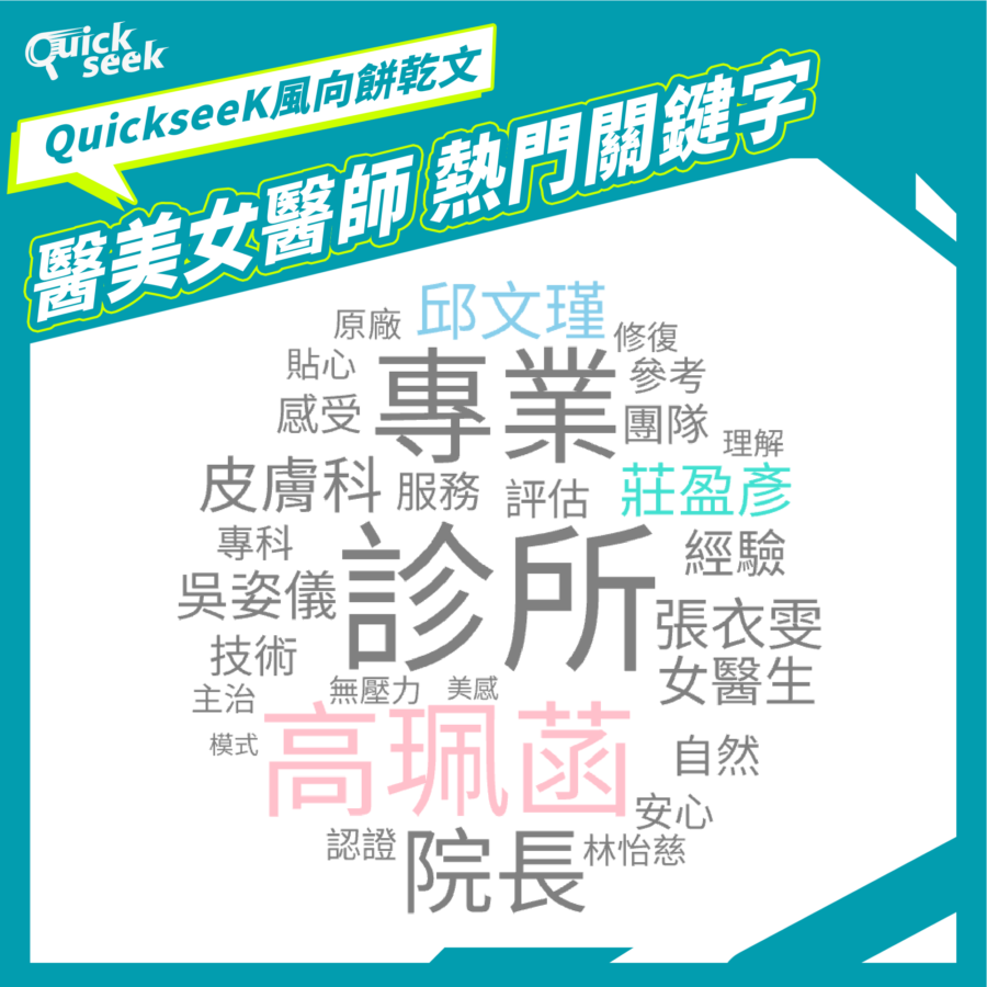 但是,醫美療程中醫師技術性與美感亦是關鍵影響要素,一派網友認為女醫師美感更符合女性審美觀,因而會特別挑選具經驗的女醫師,QuickseeK利用數據分析技術將全台知名醫美女醫師聲量以文字雲呈現,發現當中以高珮菡、邱文瑾與莊盈彥以高網路討論度奪下前三名。