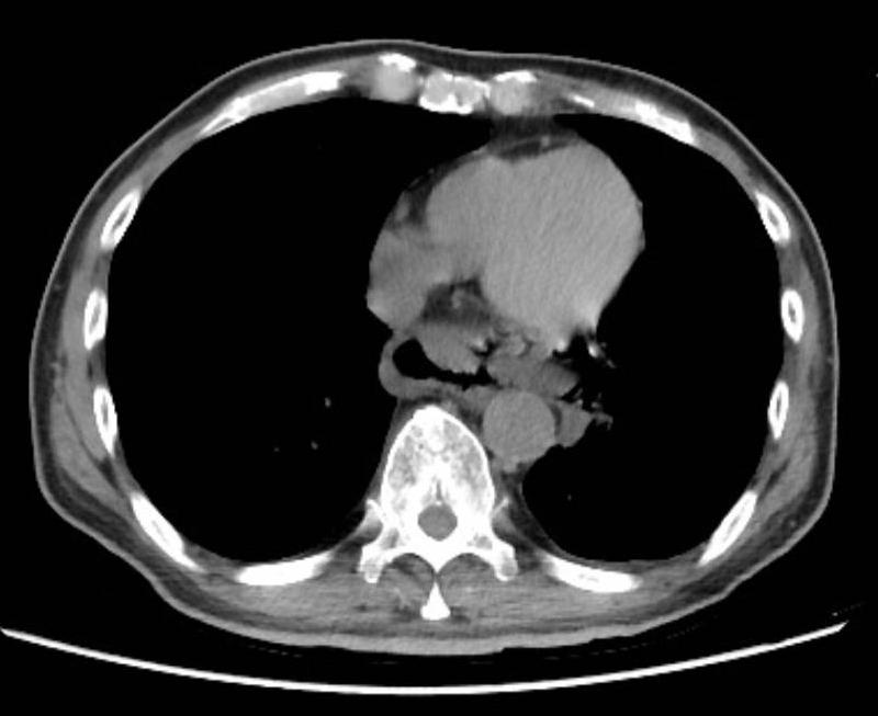 老張在加護病房期間接受抗生素治療膿胸及縱膈腔炎,並以空腸造口灌食提供營養。經過三周積極治療下病況逐漸穩定好轉,移除呼吸器後轉一般病房治療照護一周後順利康復出院。(圖片說明:CT顯示遠端食道裂傷。