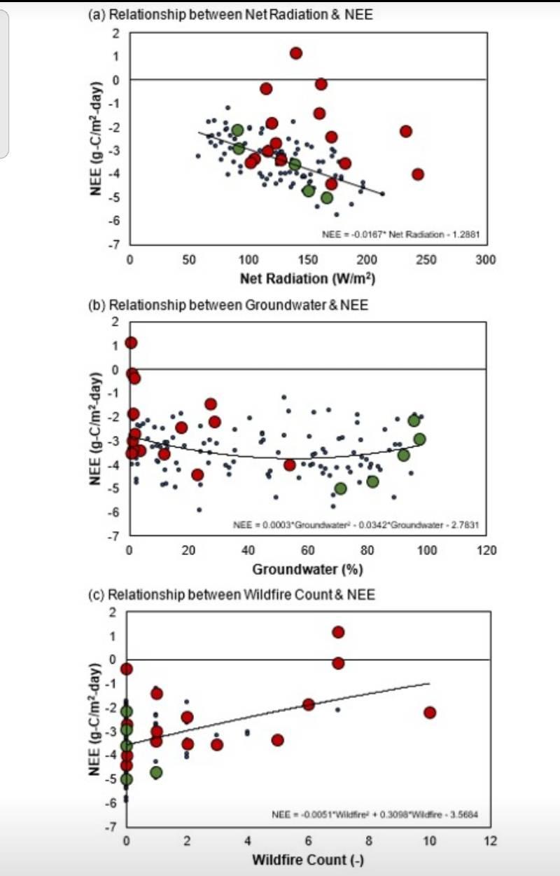 在乾旱期間,台灣先進的偵測系統發現森林生態系統釋放出超過吸收量的二氧化碳,短暫失去了其作為碳匯的自然功能;而乾旱促成森林大火的發生機率,更加影響碳匯。這個結果也顯示監測地下水位能對碳通量異常、提供有1至2個月的預測期,有助於政府監測碳排。