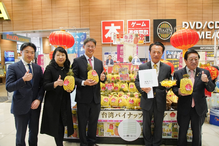 嘉義縣長翁章梁今天(7)日在山口縣丸久超市推廣嘉義鳳梨,出席貴賓包括丸久株式會社社長田中康男、山口市市長伊藤和貴、台農發公司總經理唐淑華、打貓果菜生產合作社理事主席陳映延、船昌株式會社社長關野貴文、台北駐福岡辦事處處長陳銘俊等人。
