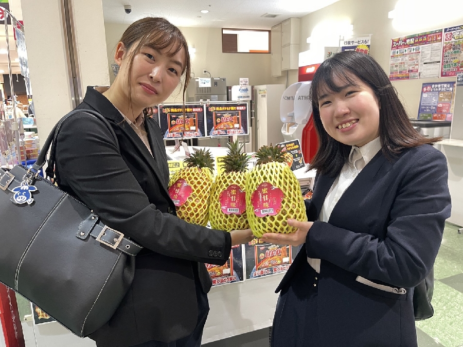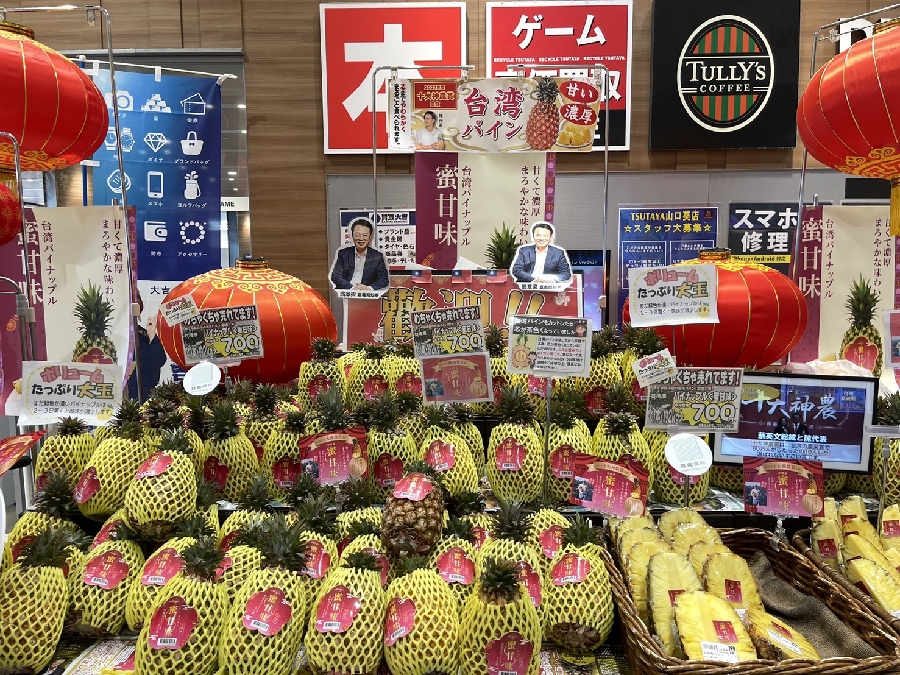 上架首日的嘉義「蜜甘味」專屬櫃位前,已有日本消費者前來採購。田中康男社長表示,去年採購嘉義縣鳳梨獲得消費者非常好的回饋,今年還會持續對產地採購。