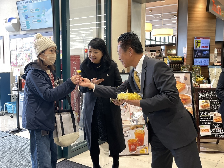 田中社長提到,縣長翁章梁有熱情和活力,遠從台灣飛來日本推廣鳳梨,接下來還要前往九洲地區福岡縣、大分縣,分享來自台灣的新鮮美味,期待明年可以向東北拓展,讓全日本都吃的到嘉義鳳梨。