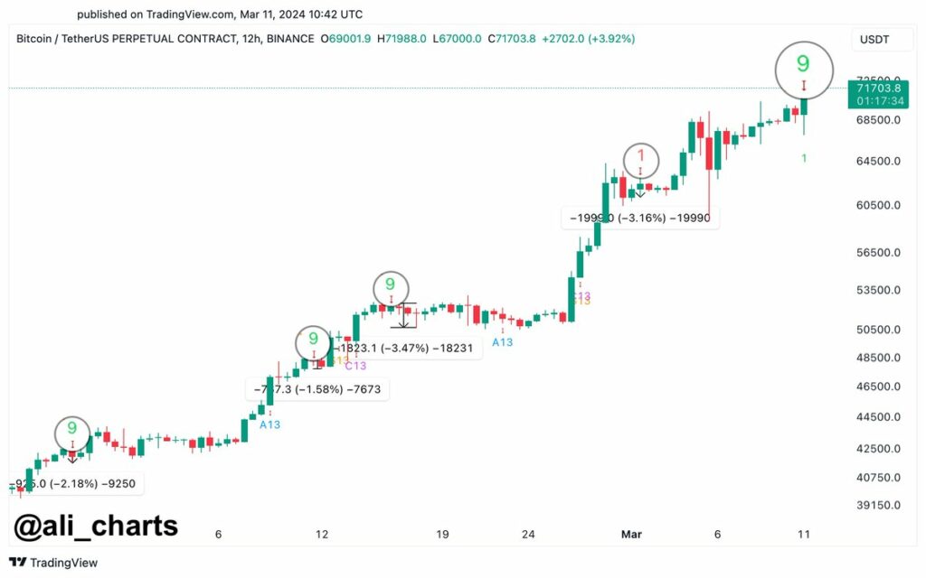 有獨立分析師提醒,目前比特幣價格交投於 71,700 美元上方,警告短期交易者可能會出現逆轉。獨立分析師 Ali 分享「TD 序列指標(TD Sequential)」時指出,該指標在 BTC 12 小時圖表中已發出賣出訊號,並解釋指「自 2 月初以來,每當該指標顯示賣出時,比特幣的價格都會下跌 1.6% 至 3.5% 。」