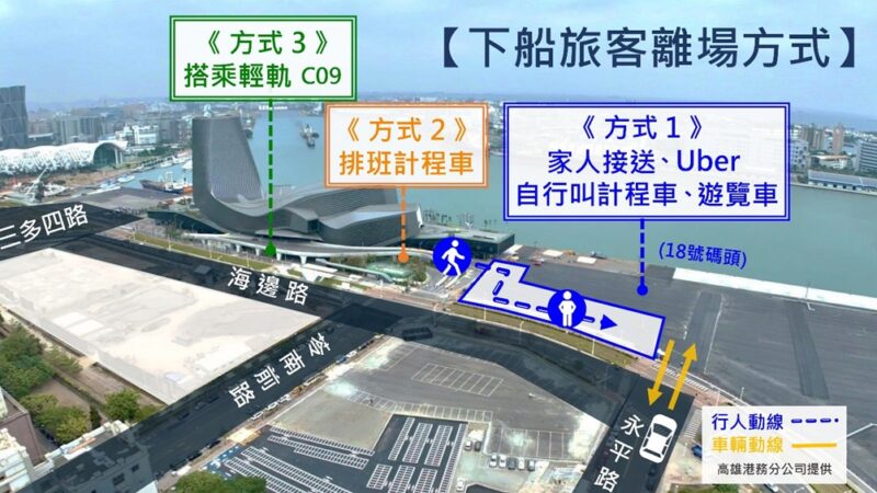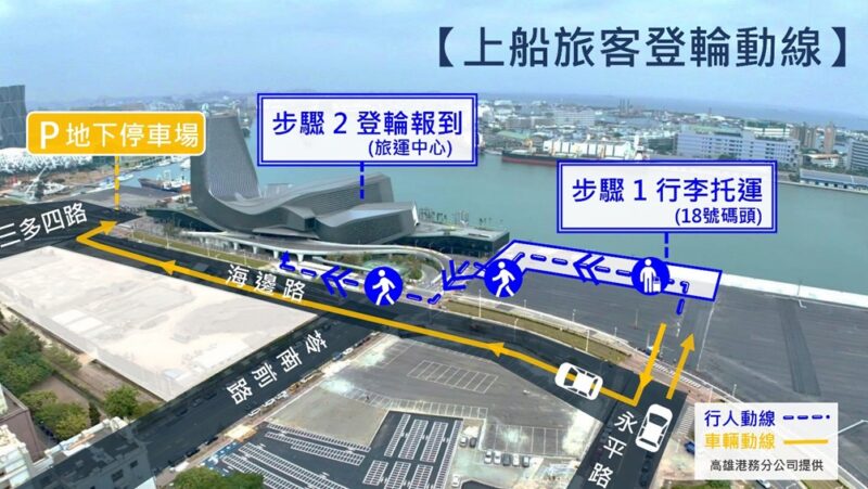 除此之外,高雄港務分公司及港區CIQS等各公務單位為提供郵輪旅客更順暢、舒適的通關登輪環境,持續優化通關動線。本次母港作業動線與去年不同,請當日欲搭乘郵輪出國的旅客務必留意,不論自行開車與否,應依照旅行社安排的分批報到時間,先至「18號碼頭(永平路與海邊路口)」提交行李托運後,再至旅運中心1樓報到。而欲自行開車接載下船旅客的親友(含多元計程車及遊覽車等),亦至「18號碼頭接送區」接載,現場應遵守工作人員及地面標線的引導,以提升作業效率並節省寶貴的時間。