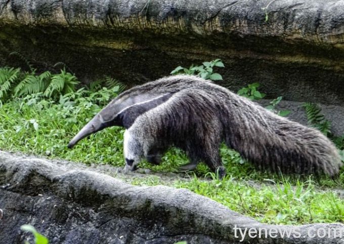 台北動物園表示,大食蟻獸分布於中、南美洲熱帶雨林,是全世界四種食蟻獸體型最大的,體長可達182~217 cm,成體的體重也能超過40公斤;牠們的頭部超級細長,眼睛耳朵都非常小,吻部看似長管狀,雖然沒有牙齒,但運用厲害的嗅覺、強大的前肢以及超過60公分長的舌頭來配合,想吃到美味的蟻窩大餐一點也不困難;另外牠們的毛長而堅硬,同時擁有長而華麗的尾巴,除了能幫助身體平衡外,睡覺的時候還能當被子保暖,大食蟻獸的身體構造,從頭到尾都值得討論及學習。