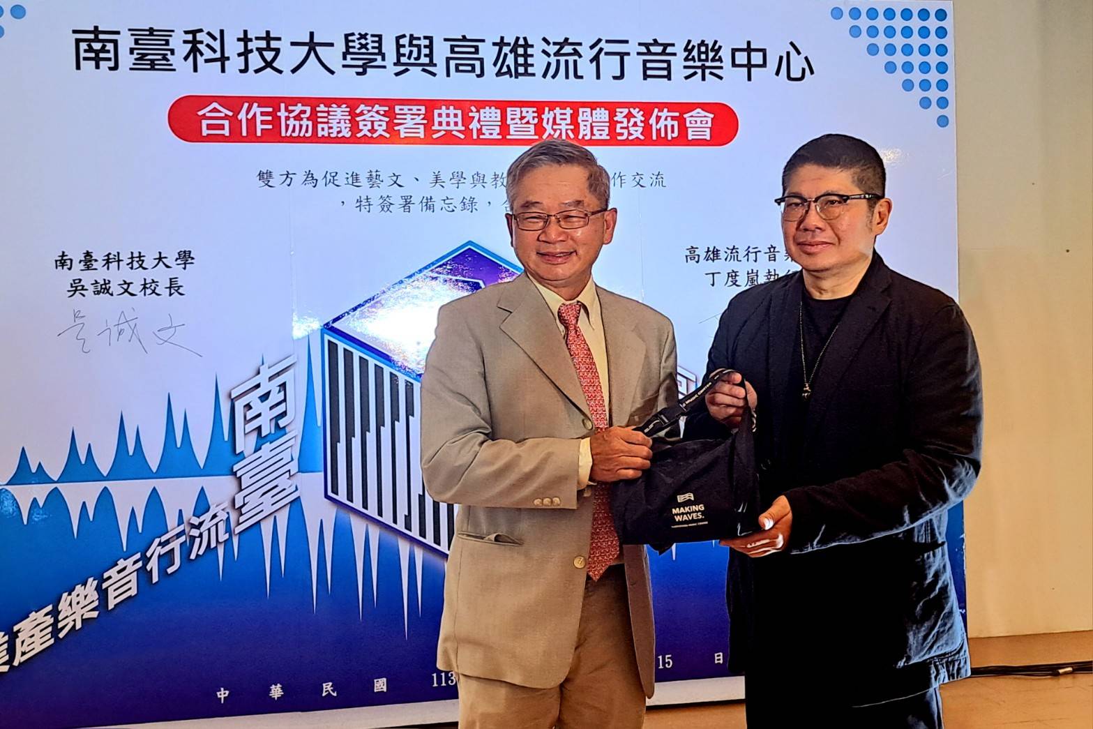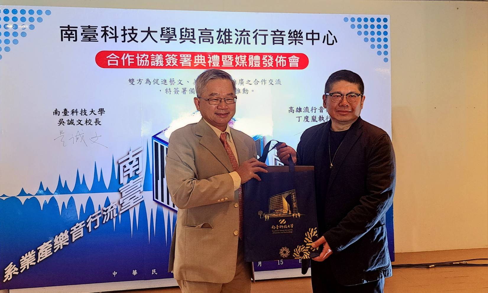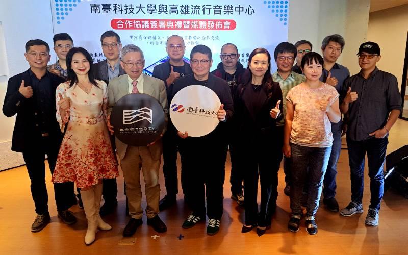 【大成報記者于郁金/臺南報導】南臺科技大學與高雄流行音樂中心合作協議簽署典禮於3月15日舉行,南臺科大校長吳誠文與高雄流行音樂中心執行長丁度嵐代表各自機構簽署合作備忘錄,訂定了一系列合作項目與條款,此次合作備忘錄簽署,標誌著南臺科技大學與高雄流行音樂中心將共同開啟一段新的旅程,以推動藝文教育發展為己任,促進藝術與教育領域交流與合作,為南臺灣地區文化事業注入新動力與活力。