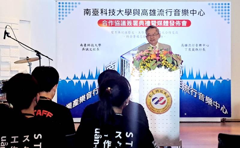 南臺科技大學校長吳誠文表示,臺灣流行音樂產業不斷提升,促成流行音樂產業需要專業人才日益複雜,從以前傳統宣傳模式,至今加入很多現代酷炫科學元素,但追根究底,藝術仍是要感動人心,所以實體展演仍是很重要部分,成功展演更有賴團隊合作;南臺科大流行音樂產業系學生,在學期間必須完成創作、表演到讓作品產生可感動觀眾價值,必須讓各項專長整合在一起,成為出色流行音樂產業人才,希望將來讓學生多多與產業合作,展現學習成果。(于郁金攝)