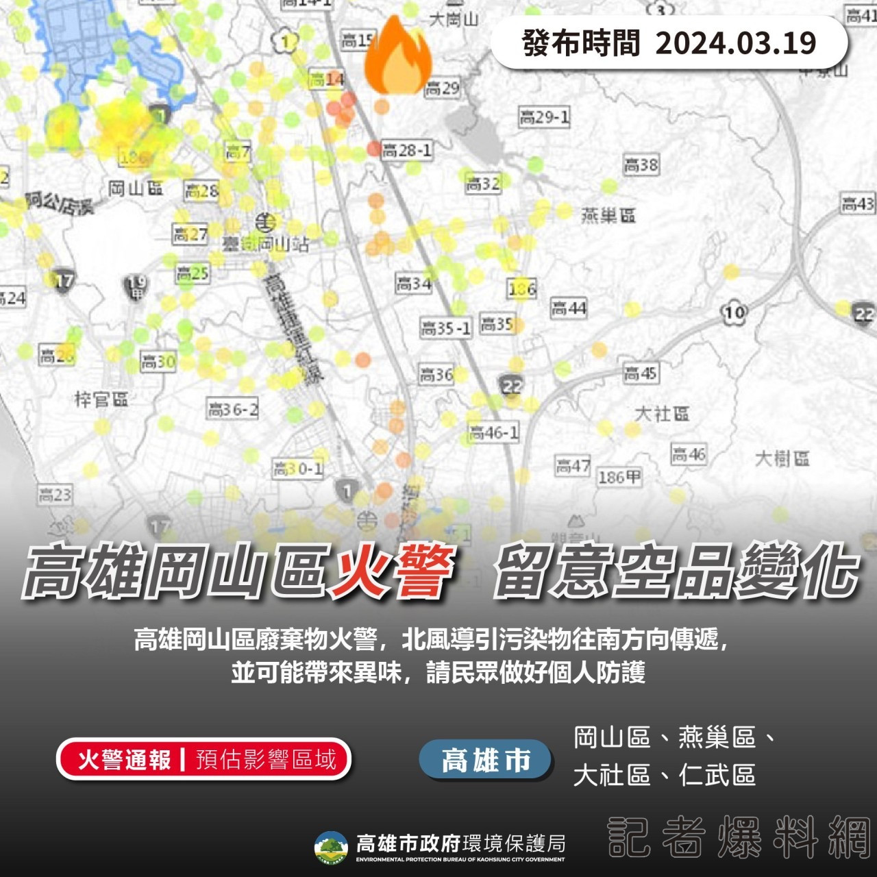 環保局表示,目前風向為北風,消防隊佈線搶救中,需注意下風處可能受異味影響,也提醒岡山區、燕巢區、大社區、仁武區民眾儘量待在室內、緊閉門窗、減少外出。