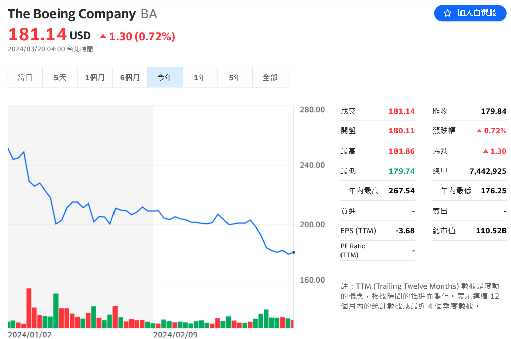 受到監管機構調查影響,波音放緩737 Max機型的生產速度,導致交付急遽減少,2月份僅交付17架737 Max機型,數量對比去年12月攔腰折半,波音因MAX機型的品質瑕疵,股價從年初迄今已崩跌30%。