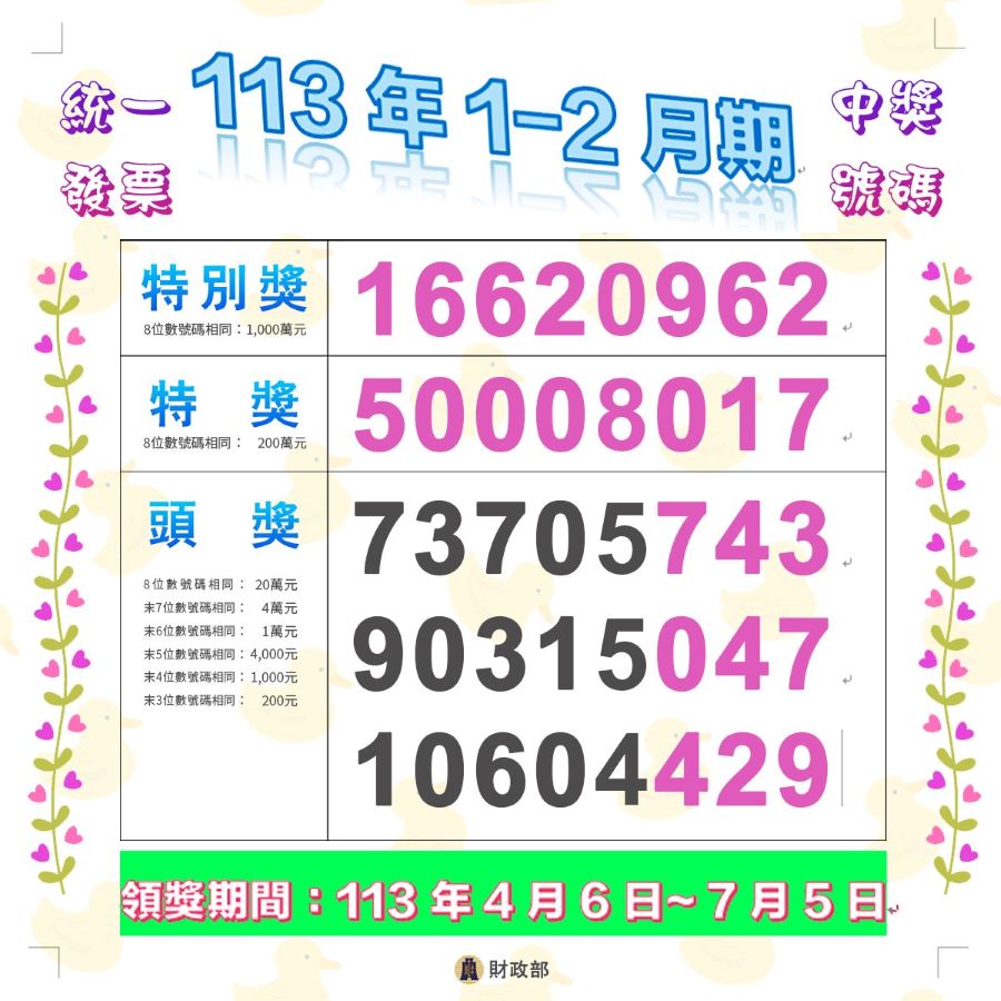 財政部今(25)日公布113年1、2月統一發票中獎號碼,1000萬元「特別獎」的8位號碼為「16620962」;200萬元「特獎」8位號碼為「50008017」;另外3組20萬元「頭獎」的8位號碼分別是「73705743」、「90315047」、「10604429」。
