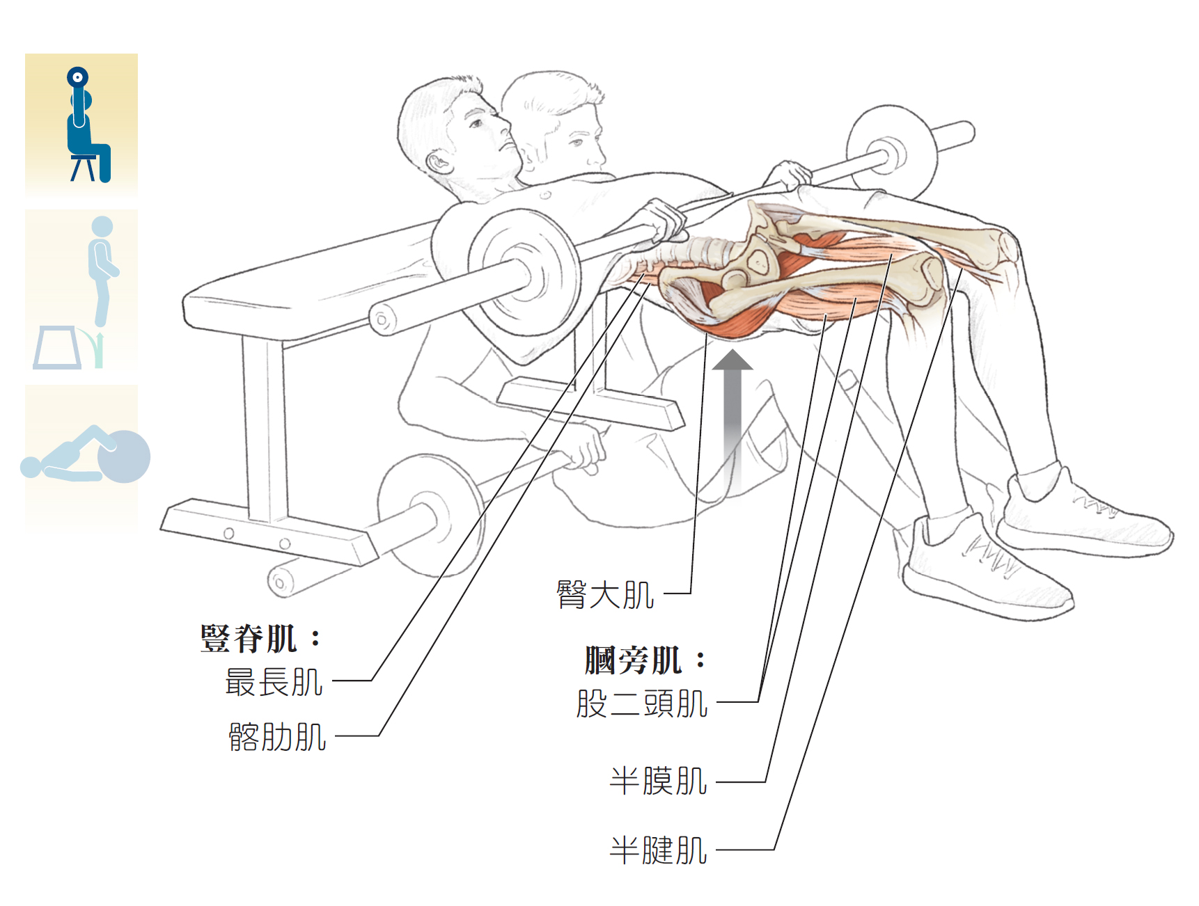 - 次要:膕旁肌(半腱肌、半膜肌、股二頭肌)、豎脊肌(髂肋肌、最長肌、棘肌)